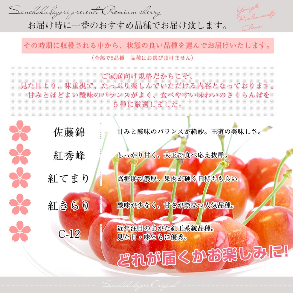 品種:佐藤錦、紅秀峰、紅てまり、紅きらり、C-12の中でいずれかの品種