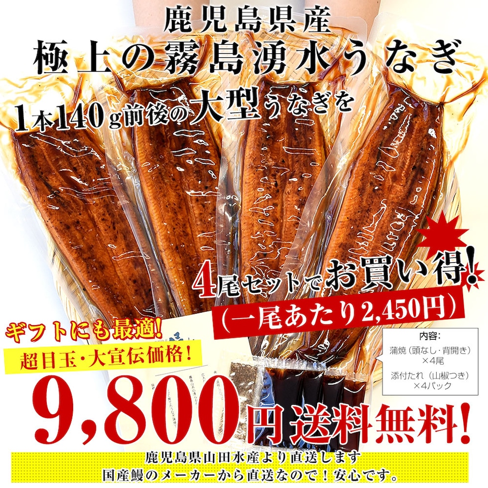 ギフトにも最適! 鹿児島県志布志産 山田水産 霧島湧水うなぎ 長蒲焼き 大サイズ4尾セット(140g前後×4尾)送料無料 鰻師 加藤尚武さん 鰻 ウナギ クール冷凍便 ギフト