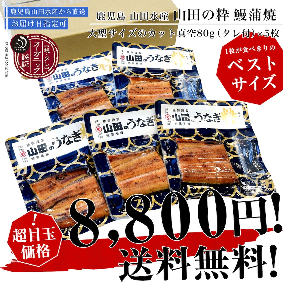 鹿児島県産 山田水産の極上国産うなぎ蒲焼「山田の粋(やまだのいき)」(大型サイズのカット真空80g×5枚) )送料無料 鰻蒲焼 ウナギ ※クール冷凍便