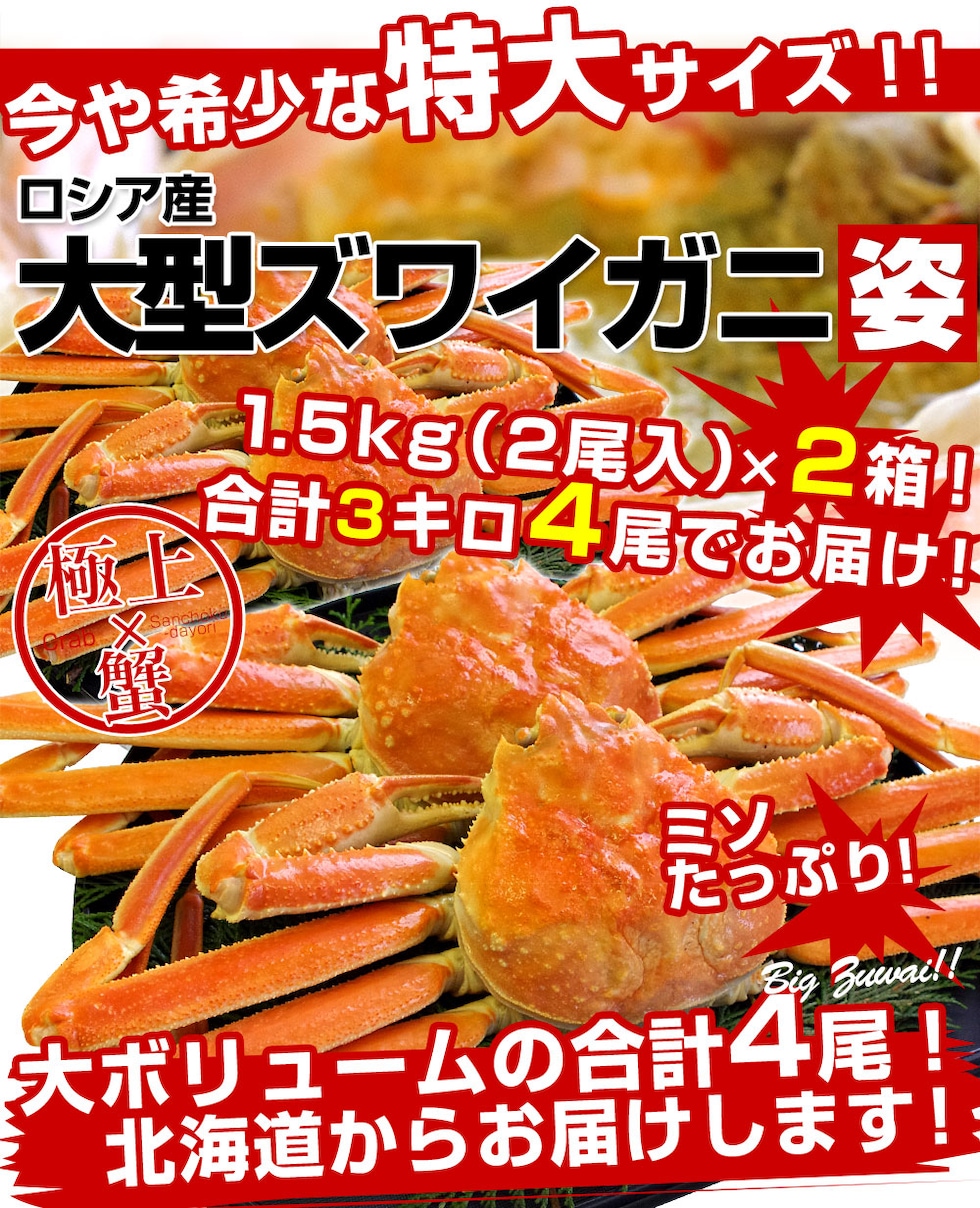 北海道より直送 高級ズワイガニ姿 大型サイズ 山盛り 1.5Kキロ(2尾入り)×2箱セット (合計3キロ4尾) 送料無料 ズワイ カニ かに 蟹 カニみそ