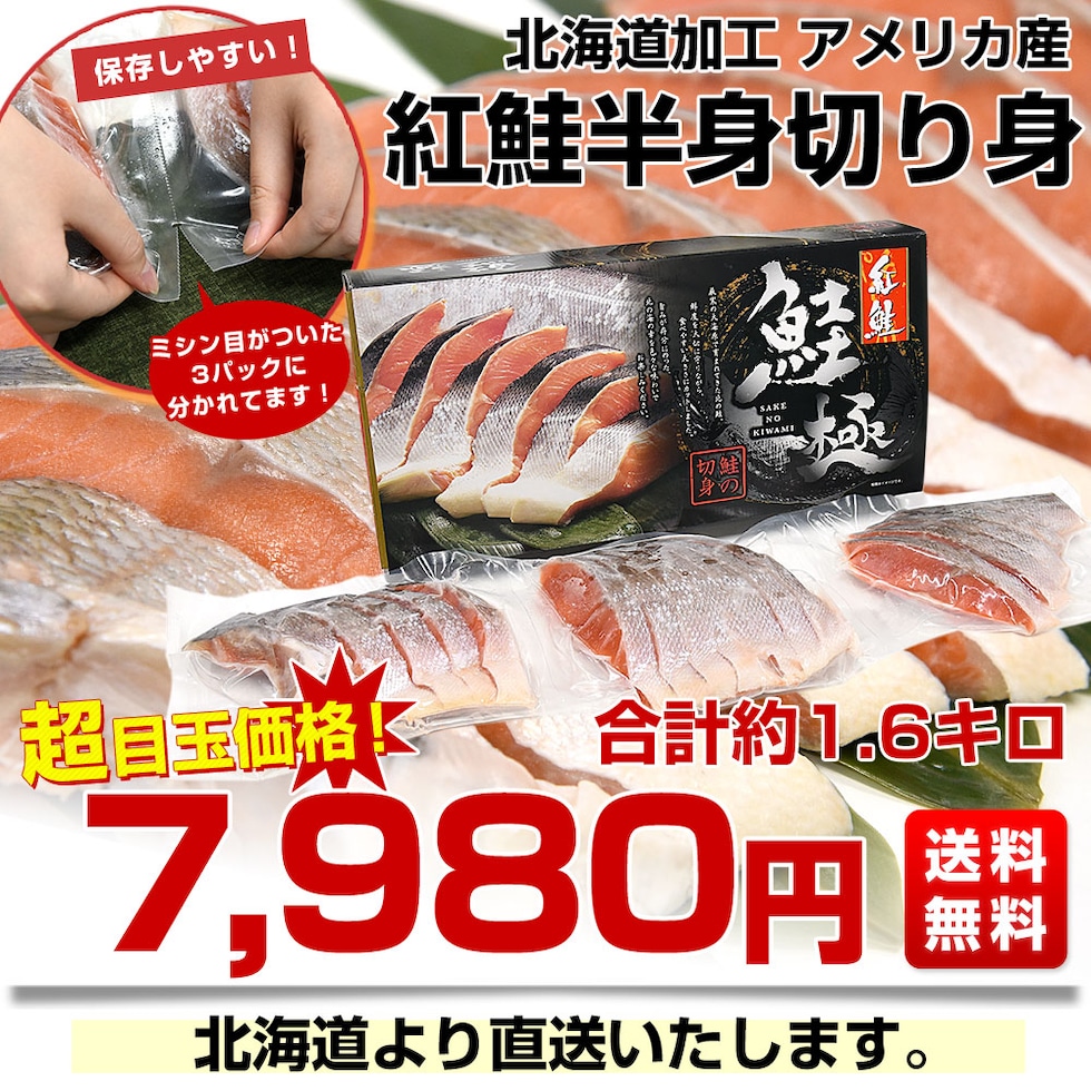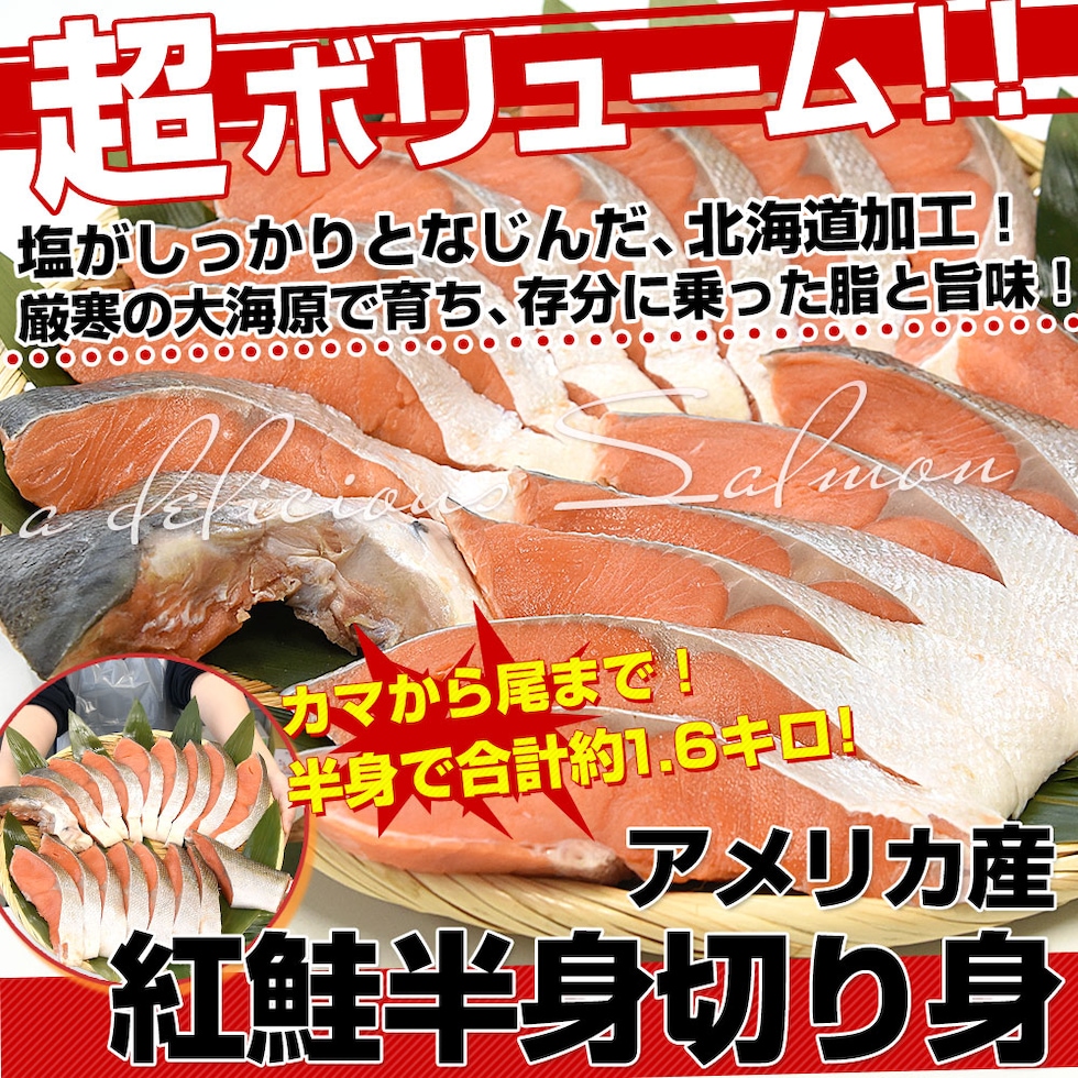 北海道から直送 北海道加工 紅鮭半身切身 約1.6キロ 送料無料 アメリカ産 鮭 サケ 冬ギフト