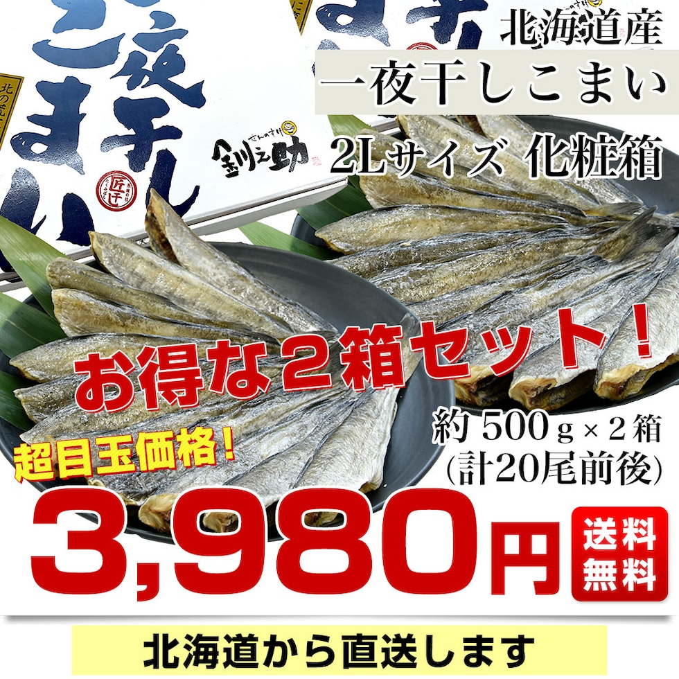 北海道産 一夜干しこまい 2Lサイズ 化粧箱 約500g(10尾前後)×2箱 合計約1kg 送料無料 氷下魚 コマイ ※クール冷凍便