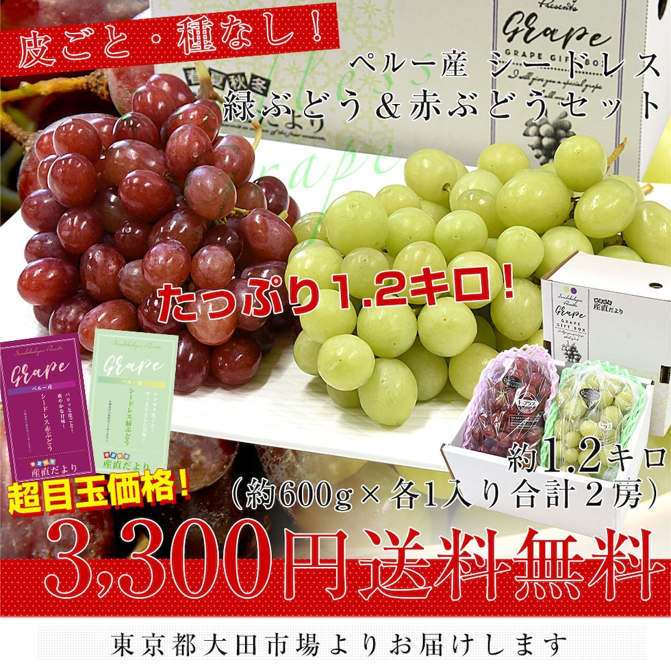 【2026年発送】種なし皮ごと食べられる!シードレス緑ぶどう&赤ぶどうセット ペルー産 約1.2キロ(約600g×2入)送料無料 種なしぶどう 輸入ぶどう 海外ぶどう