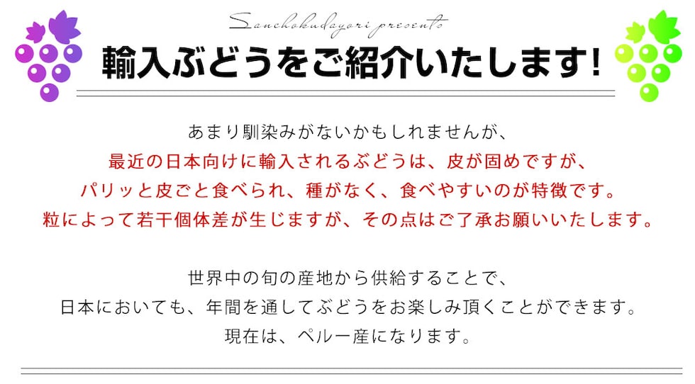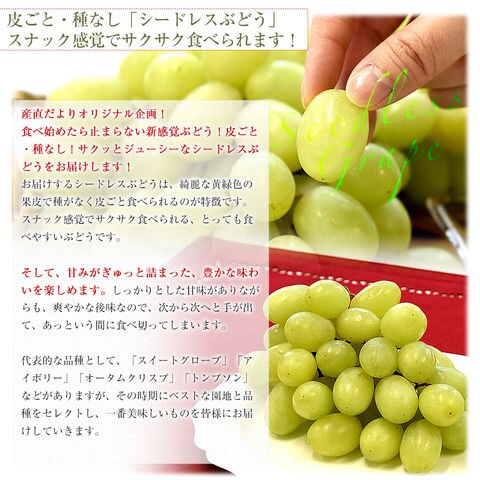 産直だより特別企画!皮ごと・種なしのシードレスぶどう!甘み豊かで、後味はすっきり!皮ごとサクサクと食べられます。その時期に最適な品種を選び、皆様に極上のぶどうをお届けしていきます。