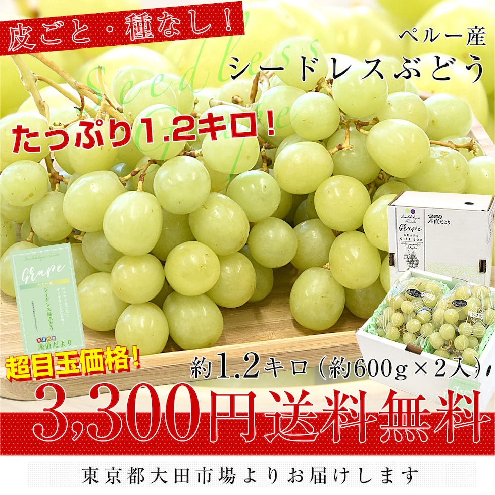 【2026年発送】皮ごと食べられる!シードレス緑ぶどう ペルー産 約1.2キロ(約600g×2入)送料無料 種なしぶどう 輸入ぶどう 海外ぶどう