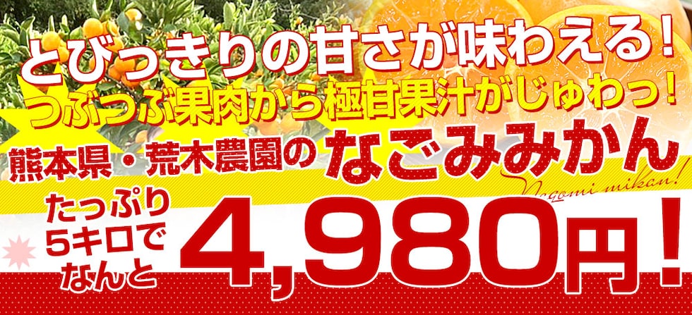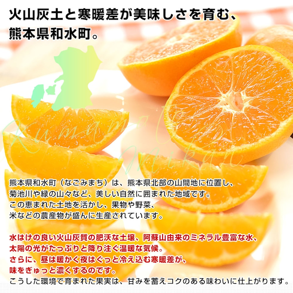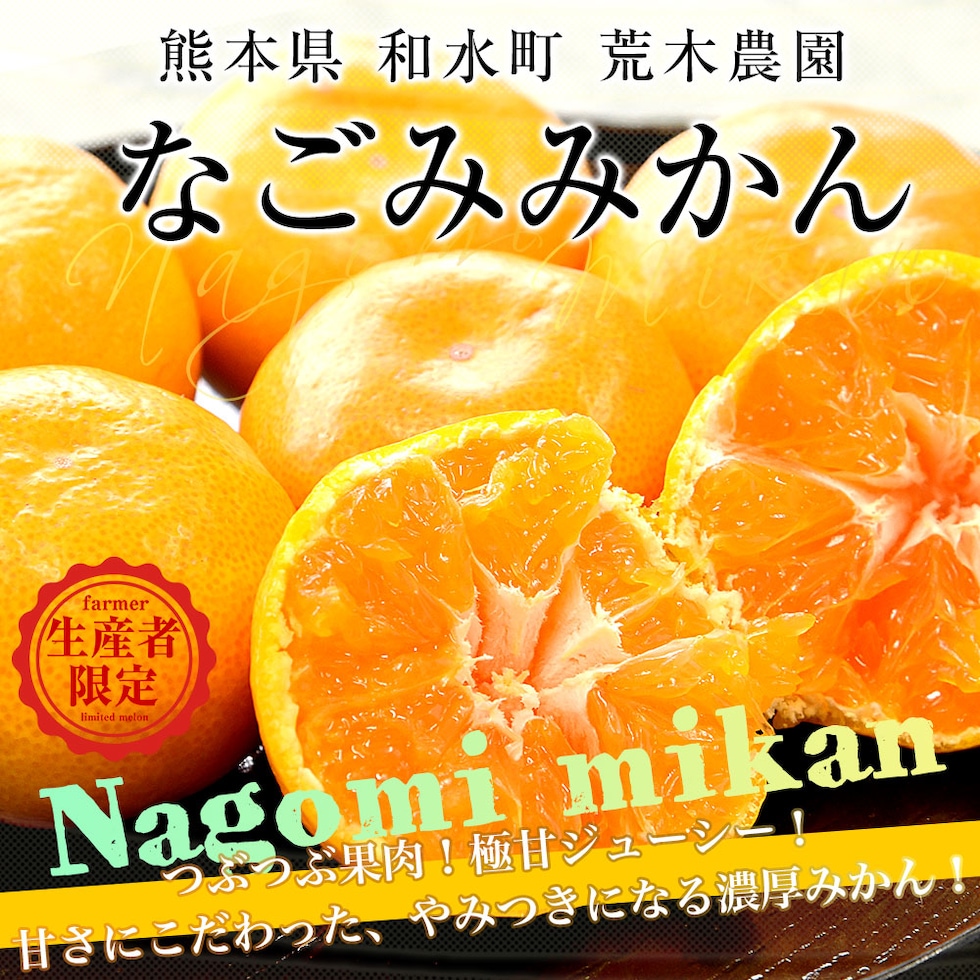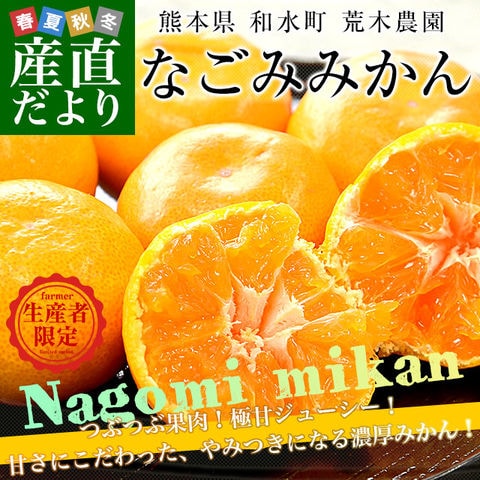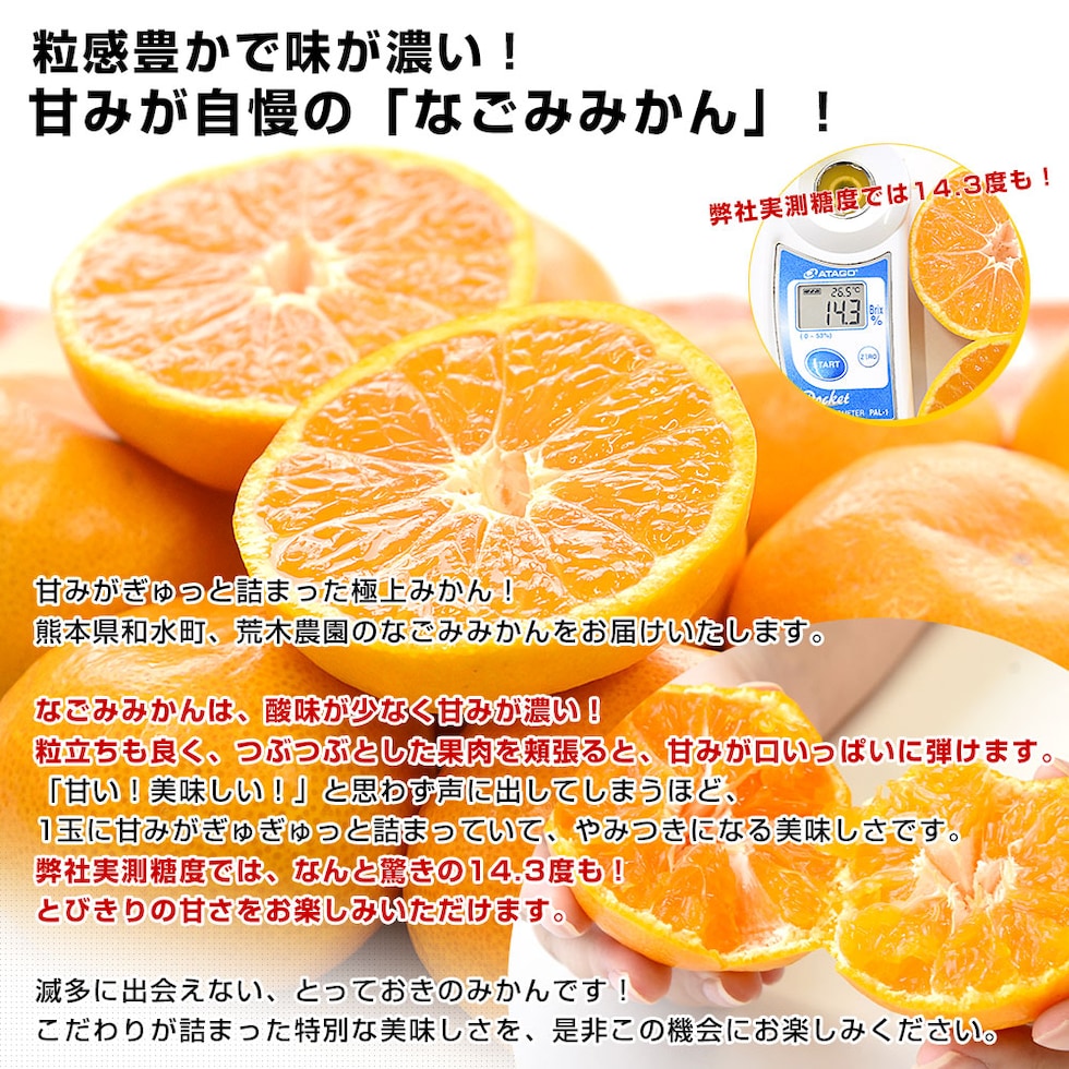 熊本県和水町・荒木農園の「なごみみかん」を産地直送でお届けします。粒立ちが良い果肉に、濃厚な甘みがぎゅっと詰まっています。酸味は控えめで、甘さにこだわった極上のみかんです。弊社実測糖度はなんと14.3度も!生産者の情熱が詰まった、やみつきになる美味しさです。