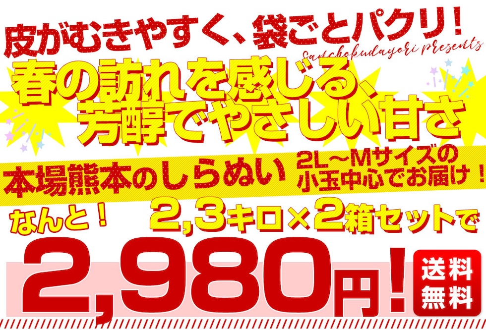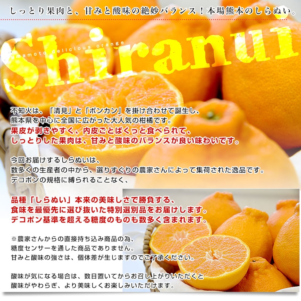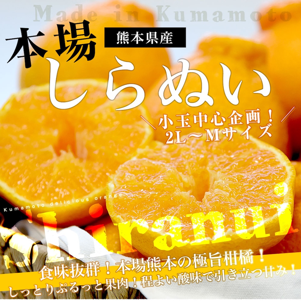 本場熊本から産地直送!極旨のしらぬいをお届けします。しっとりとした果肉で、甘みと酸味のバランスの良い味わいです。やはり元祖は違う!と言われる、名産地ならではの高品質なしらぬいを、是非お楽しみください。お届けするのは2LからMサイズの小玉中心です。小玉は比較的酸が残りやすい傾向にありますが、数日置いてからお召し上がりいただくと酸味がやわらぎ、より美味しくお楽しみいただけます。