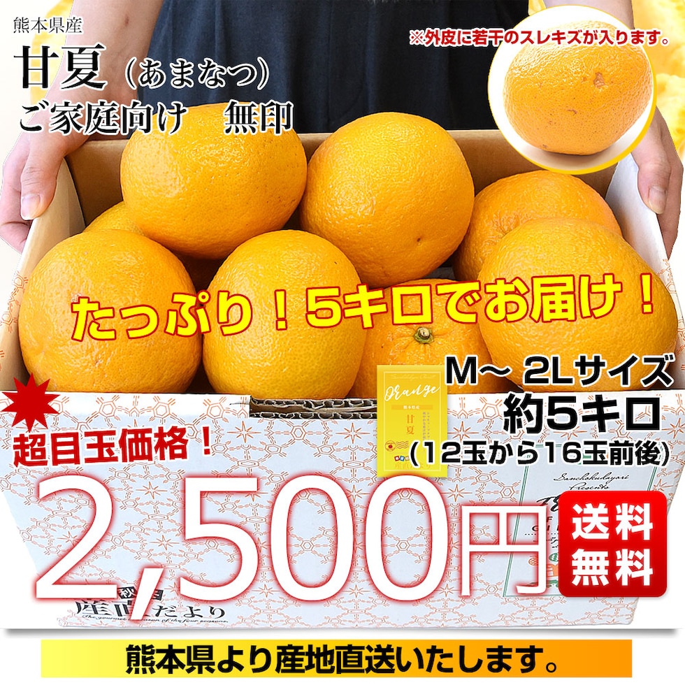 熊本県から産地直送 熊本県産 甘夏(あまなつ) ご家庭向け 無印 Mから2Lサイズ 約5キロ(合計12玉から16玉前後) 送料無料 柑橘 かんきつ