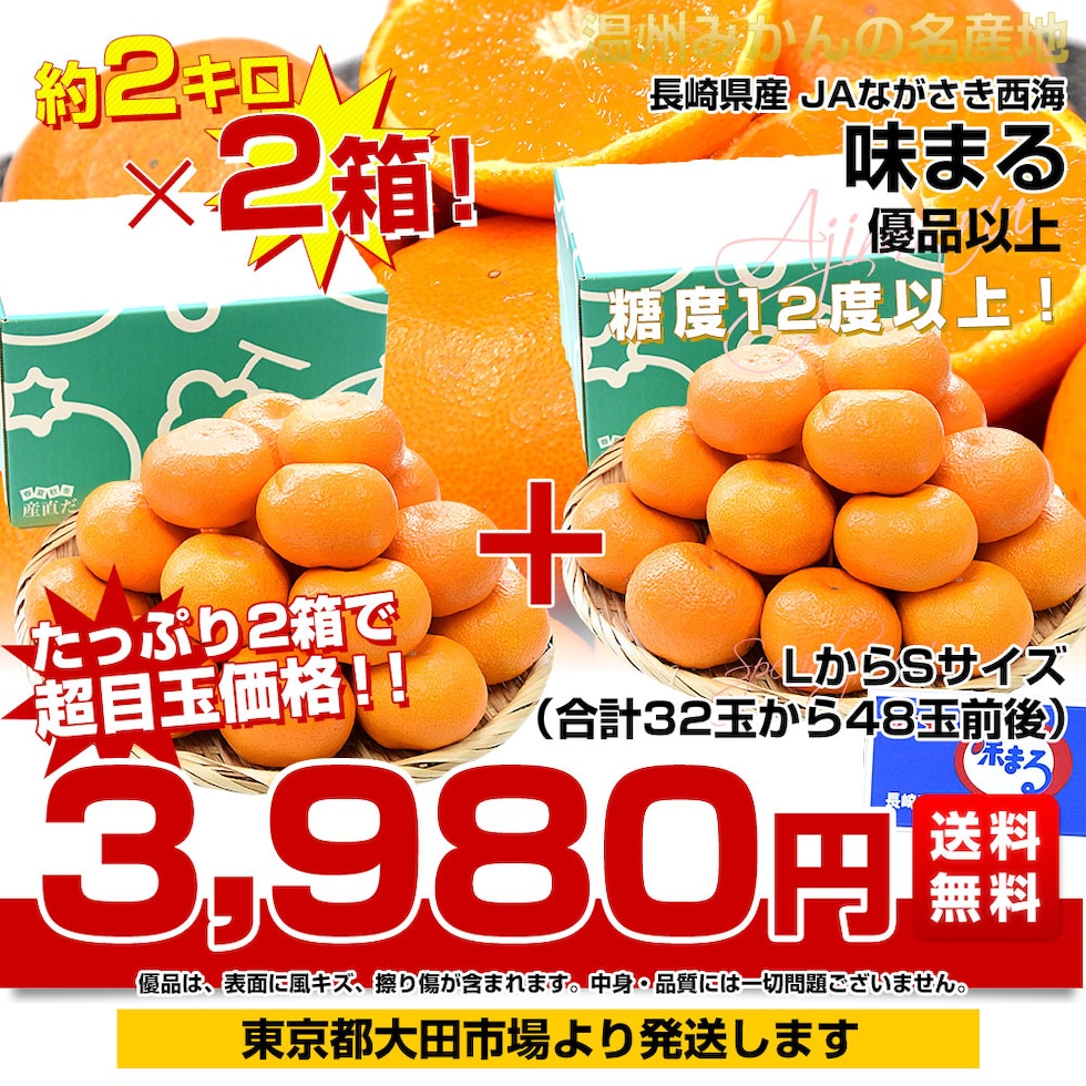 長崎県 JAながさき西海 味まる 約2キロ×2箱(合計32玉から48玉前後)優品以上 ミカン 蜜柑 送料無料