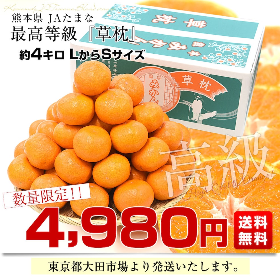 熊本県JAたまなブランドみかん、最高等級「草枕」をたっぷり約4キロお届けいたします!玉名市天水町が、夏目漱石の『草枕』の舞台となっていることから、その名が付けられました。ぷちぷちと弾けるような果肉と、甘く程よい酸味がある果汁はまさに絶品です。