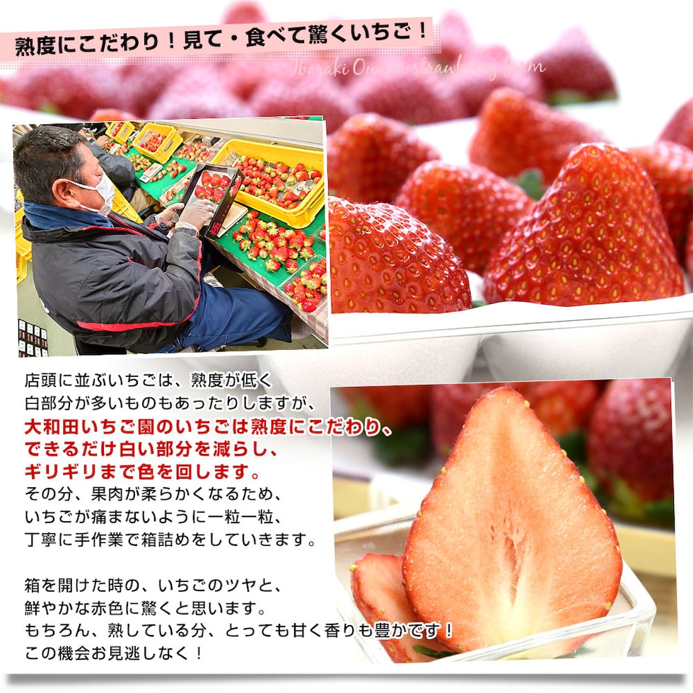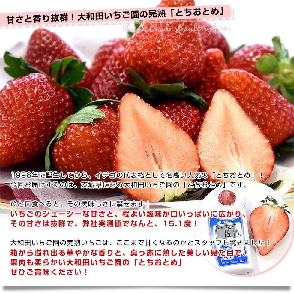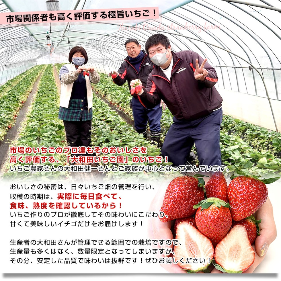 大和田いちご園の完熟いちごはここまで甘くなるのかとスタッフも驚いた、極上の「とちおとめ」をお届けします。市場関係者の間でも評価が高い、味・食感ともに抜群のいちごです。ぜひご賞味ください!