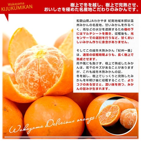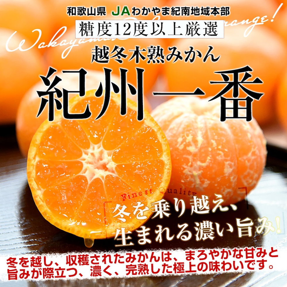 みかんの国ともいわれる和歌山県。そんな名産地からオリジナルブランド、越冬木熟みかん「紀州一番」をお届けいたします。その名の通り、冬を乗り越えたみかんです。通常のみかんよりも長く樹上で熟成させ、年明け後に収穫します。完熟したみかんは、濃い旨みと、コクのある甘さが際立つ超絶品みかんです。