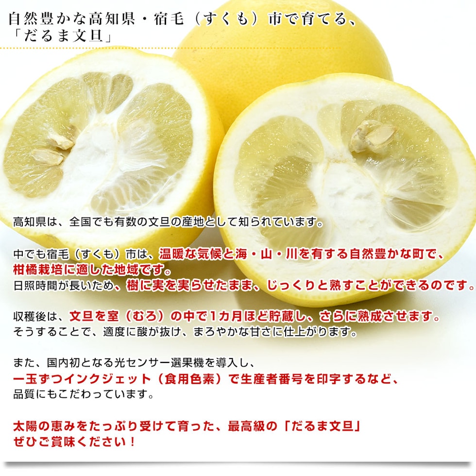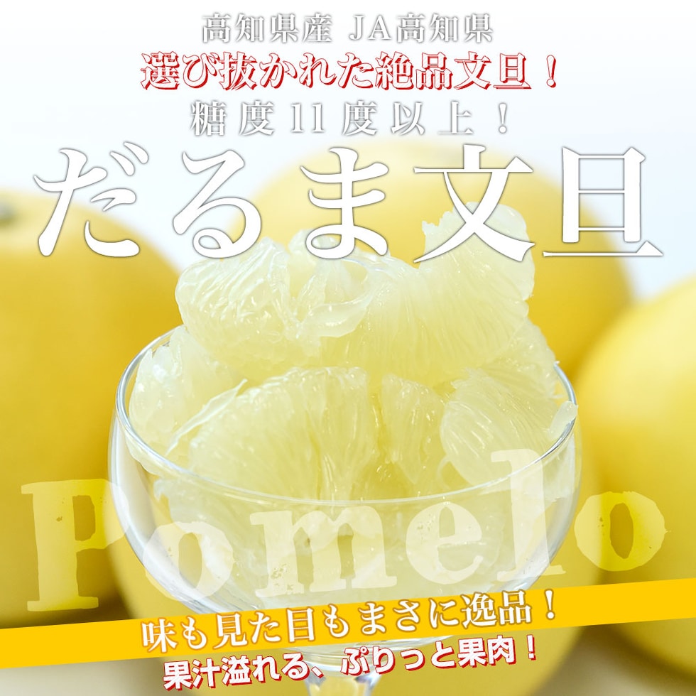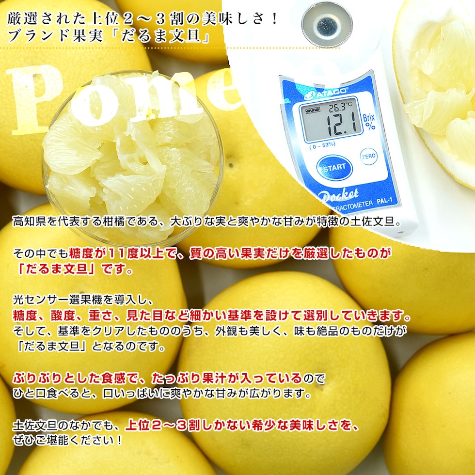 高知県を代表するフルーツ、土佐文旦の中から選び抜かれた、「だるま文旦」!糖度11度以上のものだけをお届けします。爽やかな香りとすっきりとした甘みは、他にはない美味しさです。ぷりっとした果肉とジューシーな果汁が味わえる、「だるま文旦」ぜひご賞味ください!