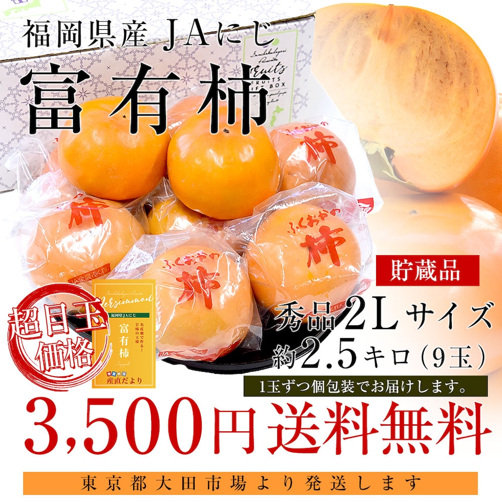 福岡県 JAにじ 富有柿 貯蔵品 秀品 約2.5キロ 2Lサイズ(9玉) 送料無料 かき カキ 甘柿
