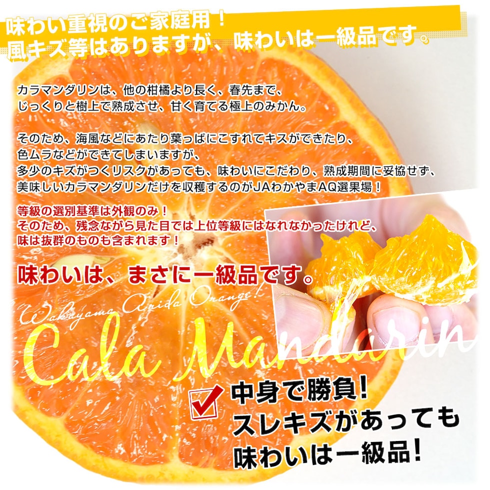 みかんとキングマンダリンの交配で生まれた、とってもジューシーな高級柑橘「カラマンダリン」。収穫に1年以上の月日を費やす極上柑橘!まるで温州みかんみたいに簡単に皮がむけ、内皮ごと食べられます。味わいはとっても濃厚で甘み豊か!味で勝負のご家庭用をお届けします。