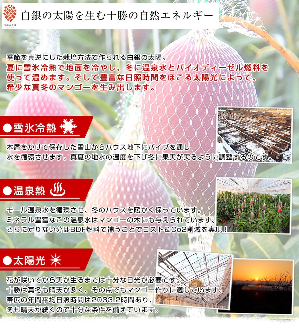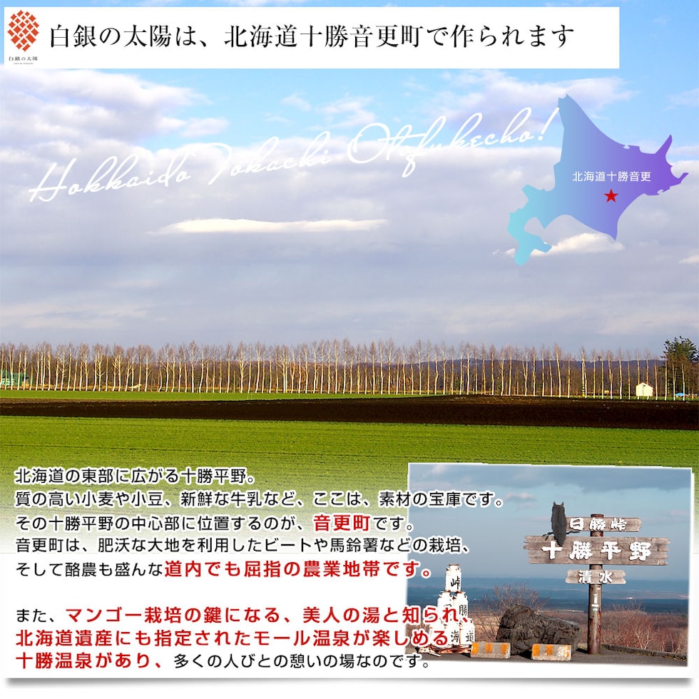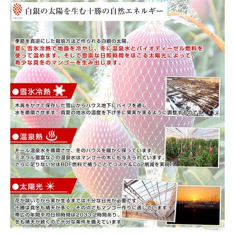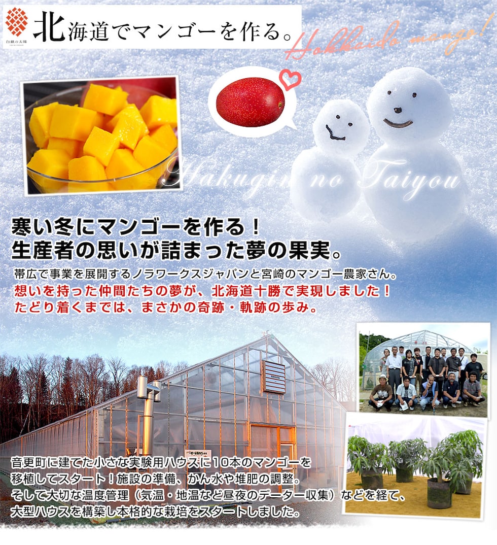 「北海道でマンゴーを育てる。」帯広で事業を展開するノラワークスジャパンと宮崎のマンゴー農家さん、想いを持った仲間たちすべての夢が北海道十勝で実現しました!とろける果肉と濃厚な甘み!驚きの糖度15度以上の白銀の太陽プレミアムです。この時期に味わうことができる完熟マンゴーはまさに感動ものです!