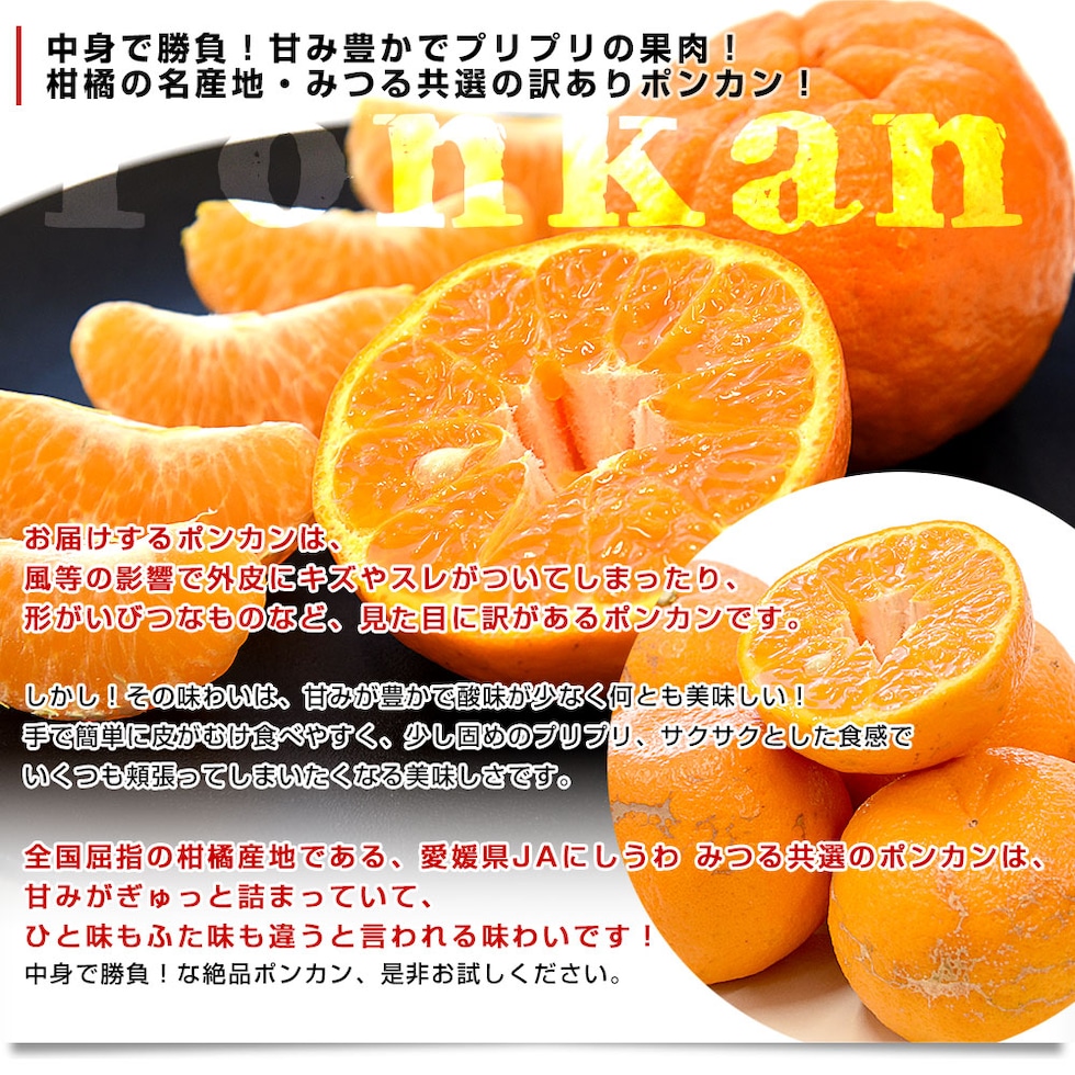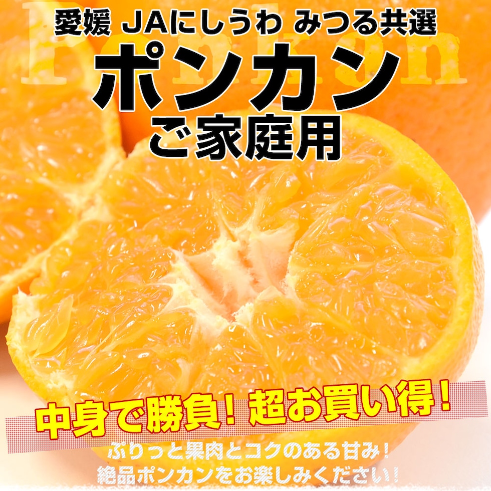 愛媛県JAにしうわみつる共選のご家庭用ポンカン!外皮にスレキズはありますが、味は抜群!潮風と太陽の中で育った絶品のポンカンです。ぷりっとした果肉に、豊かな甘みとコクがたっぷり!とってもお得にお楽しみいただけます。
