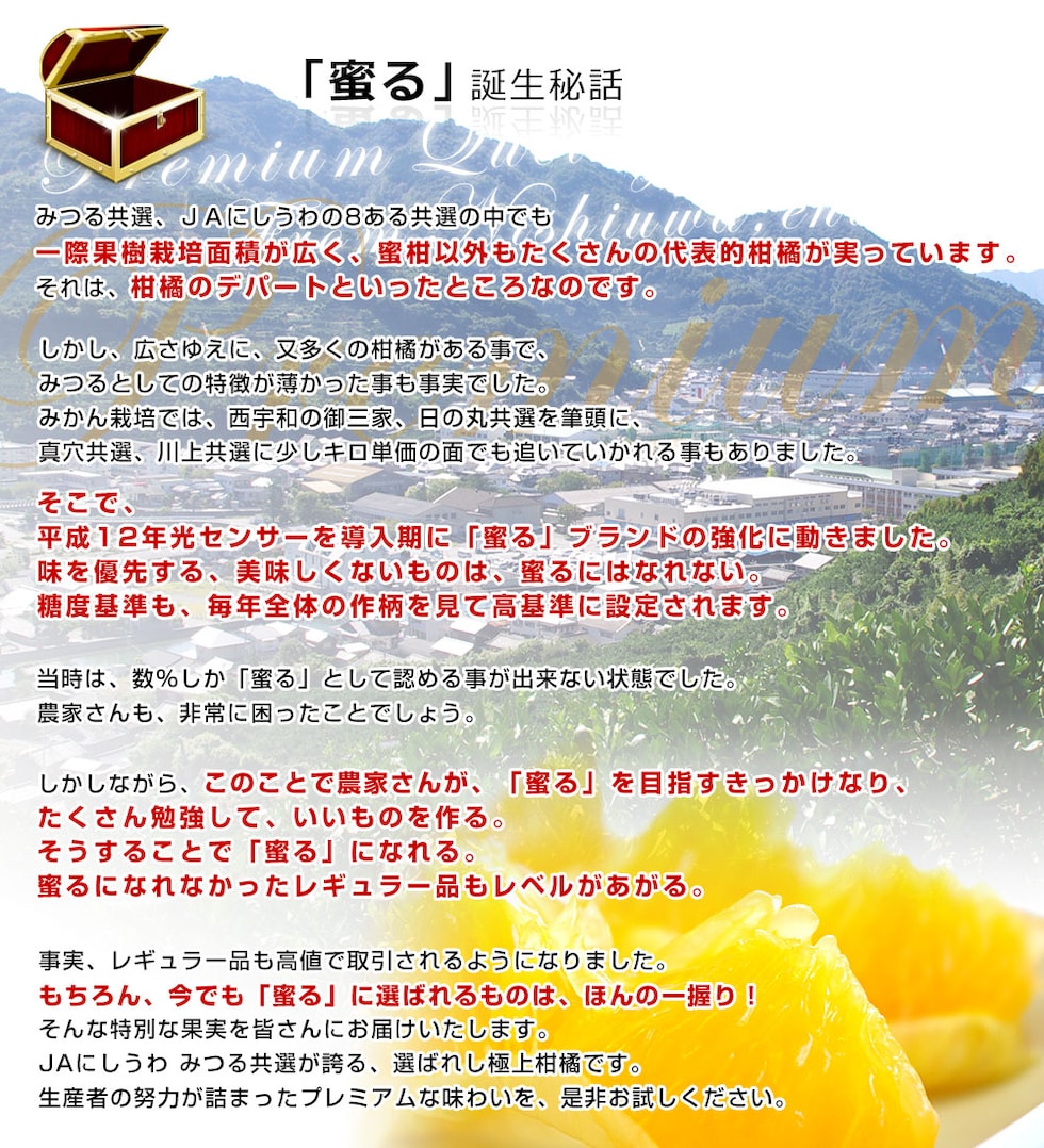 選ばれし一雫!「蜜る」、この称号はおいしさの証!みつる共選のプレミアムないよかんをお届けします。いよかんとは、柑橘界のロングセラー商品。爽やかな甘みと、プリプリとした果肉溢れる食感が楽しめます。「蜜る」に選ばれるのは、全体の中でほんの一握り。甘みと酸味のバランスも良く、飽きの来ない美味しさです。