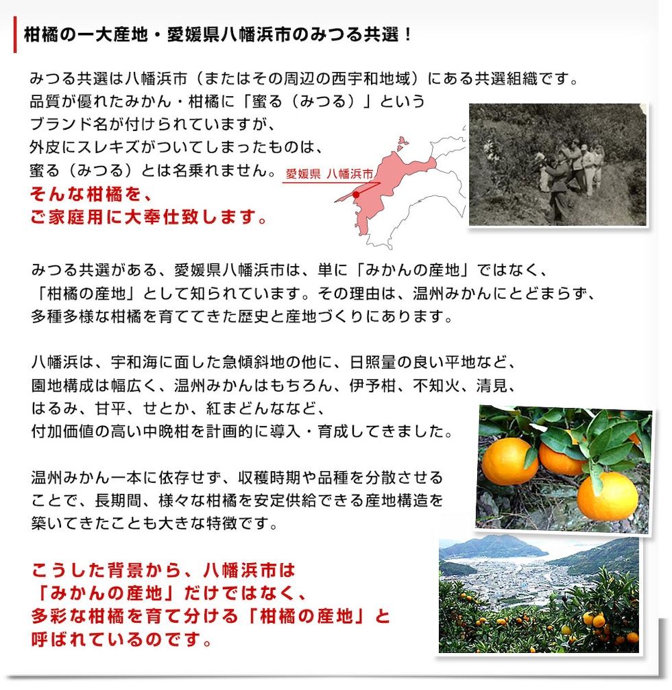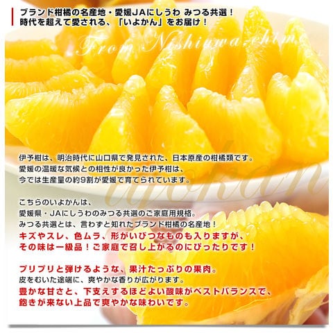 ブランドみかんやさまざまな種類の柑橘を作り上げる、JAにしうわ・みつる共選のいよかんです。傷などが少しありますが、味は一級品!ご家庭用におすすめです!いよかんとは、柑橘界のロングセラー商品。爽やかな甘みと、プリプリとした果肉溢れる食感が楽しめます。甘みと酸味のバランスも良く、飽きの来ない美味しさです。