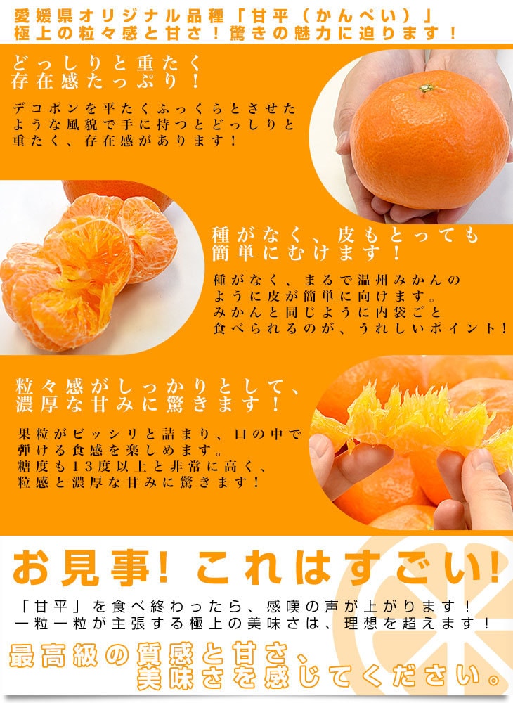 平成3年「西之香」と「不知火(デコポン)」を交配し、平成13年に現地試験開始された愛媛期待の柑橘です。ズシリと重たく存在感もたっぷり。種無しで皮が薄く濃厚な甘味と香り。まさに、旨いみかんとオレンジの条件をすべて手に入れたような究極の柑橘類です。
