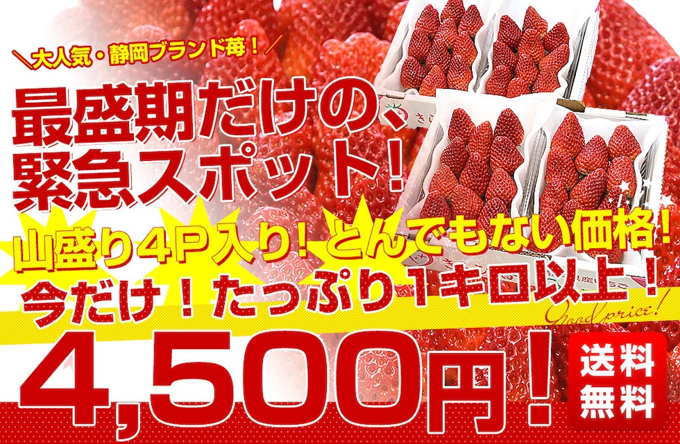 静岡県産 プレミアムいちご 超盛りきらぴ香 G たっぷり2箱 合計1キロ以上(約260g×4入り)計20粒から48粒入り 送料無料 苺 イチゴ