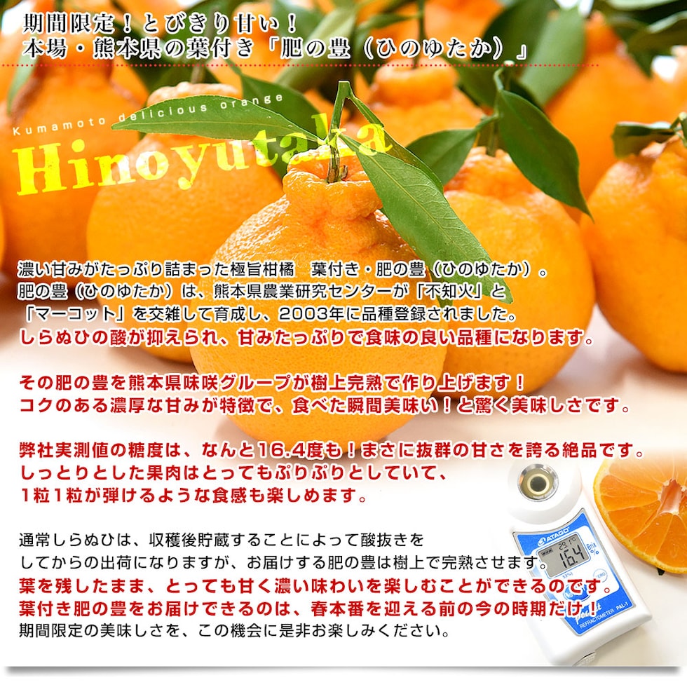 しらぬひの完成形!超レア品種「肥の豊(ひのゆたか)」コクのある濃厚な甘みが特徴で、食べた瞬間美味い!と驚く美味しさです。弊社実測値の糖度は、なんと16.4度も!葉付き肥の豊は、今の時期だけ楽しめる希少な逸品です。この機会に是非ご賞味ください!