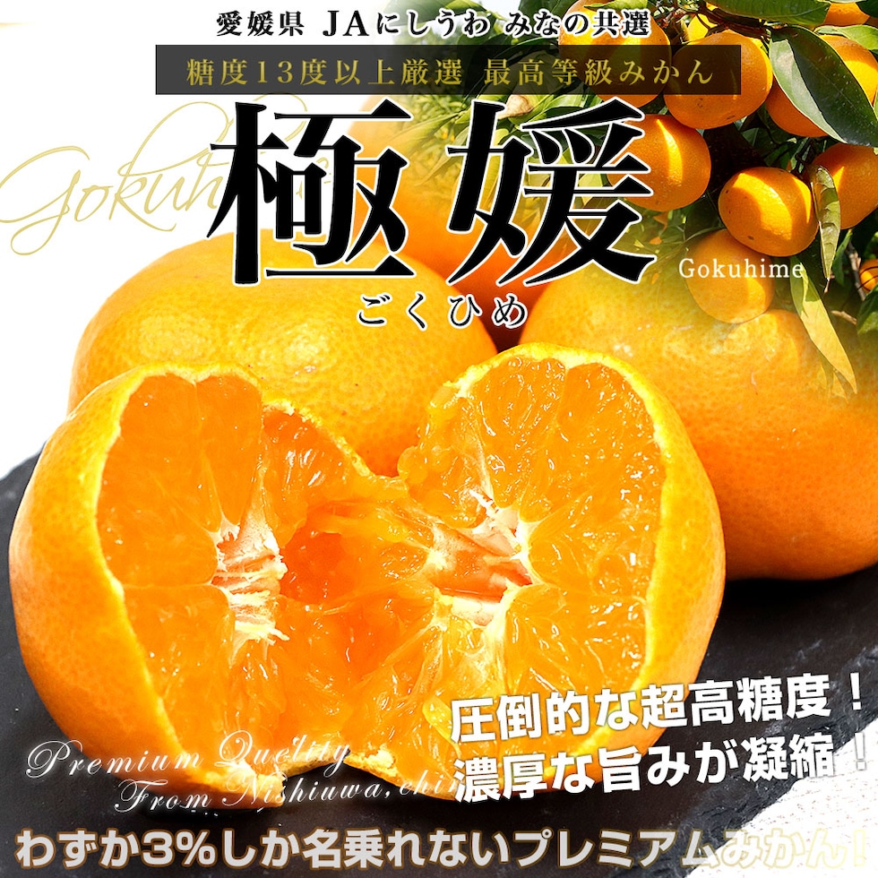 JAにしうわ・みなの共選が誇る最上位等級みかん「極媛」!極媛は、みなの共選の中でも、わずか3%ほどしか名乗れないプレミアムなみかん!なんと糖度13度以上のものだけを選び抜きました。空から、海から、石垣からたっぷりと太陽の恵みを受け、旨味が凝縮した自慢のみかんをご賞味下さい。