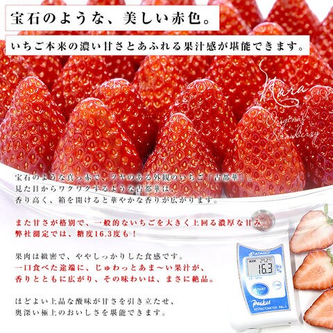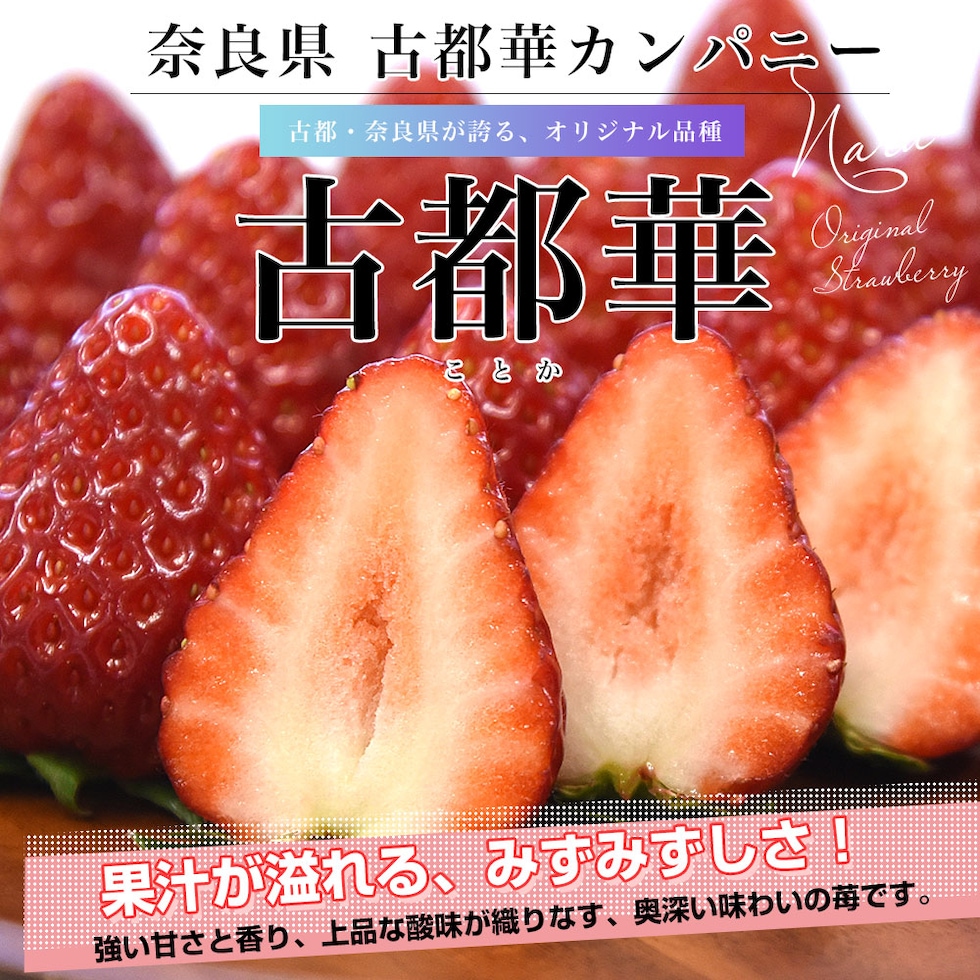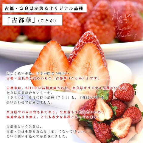 古都華は、2011年に品種登録された、奈良県オリジナル品種のいちごです。甘さが格別で、一般的ないちごを大きく上回る濃厚な甘み。弊社測定では、糖度16.3度も!あま~い果汁と高い香りが広がるその味わいは、まさに絶品。上品な酸味もあり、甘さを引き立たせ、濃厚かつ、いちご本来のおいしさや味を堪能できます。