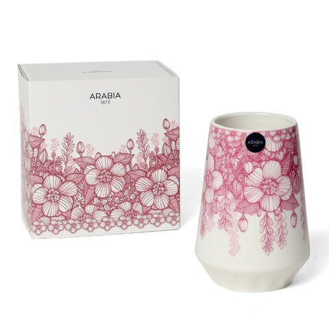 フィンランド出身のデザイナー、ヘイニ・リータフフタが、祖母のサマーハウスに咲く野ばらをイメージしてデザインした繊細で美しいフヴィラ。アラビアの古い装飾技法に興味を持ったヘイニは、この花模様をフリーハンドで描いてデザインしました。そのためかアラビアのヴィンテージのように、少しレトロな雰囲気が漂うシリーズです。