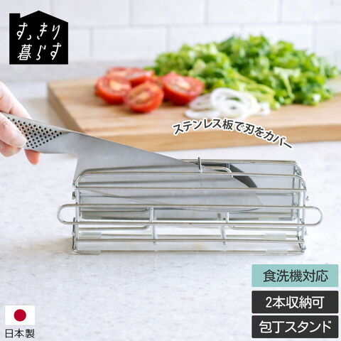 洗った後の包丁の置き場所を決めたら安定して、さらにすっきり。他のすっきり暮らす水切りかごと一緒に置いて乾かせます。包丁は左右どちらからも出し入れ可能。横置きのため、安定感があり保管の際も安心です。柄の重みで刃が浮き上がる設計。包丁の刃が傷つきません。包丁の収納スタンドとしてもお使いいただけます。ステンレス板が包丁の刃をカバーし、刃を見せずに収納できるため、そのままキッチントップへ置いても安心感のあるデザインです。| 商品番号 | MM-700192 |