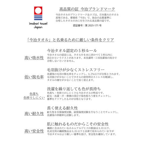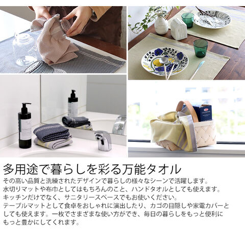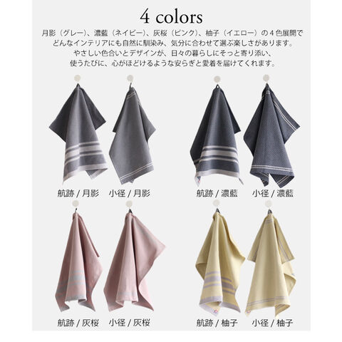| 備考 | ・最高洗濯温度は40度。漂白剤は使用不可。タンブル乾燥、ドライクリーニング不可。日陰での吊り干しをおすすめします。 ・吸水性が落ちるため、柔軟剤の使用はおすすめしません。 ・色移りを避けるため、白や淡色の生地と一緒に洗わないで下さい。 |