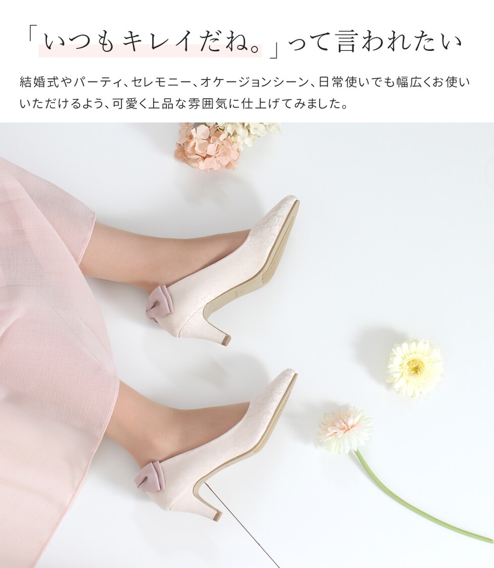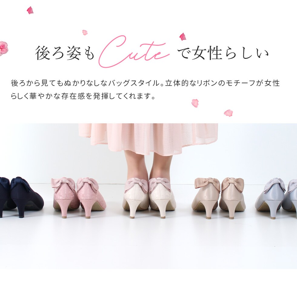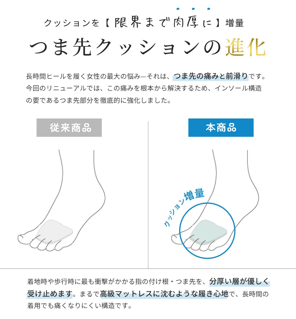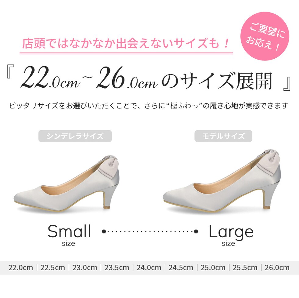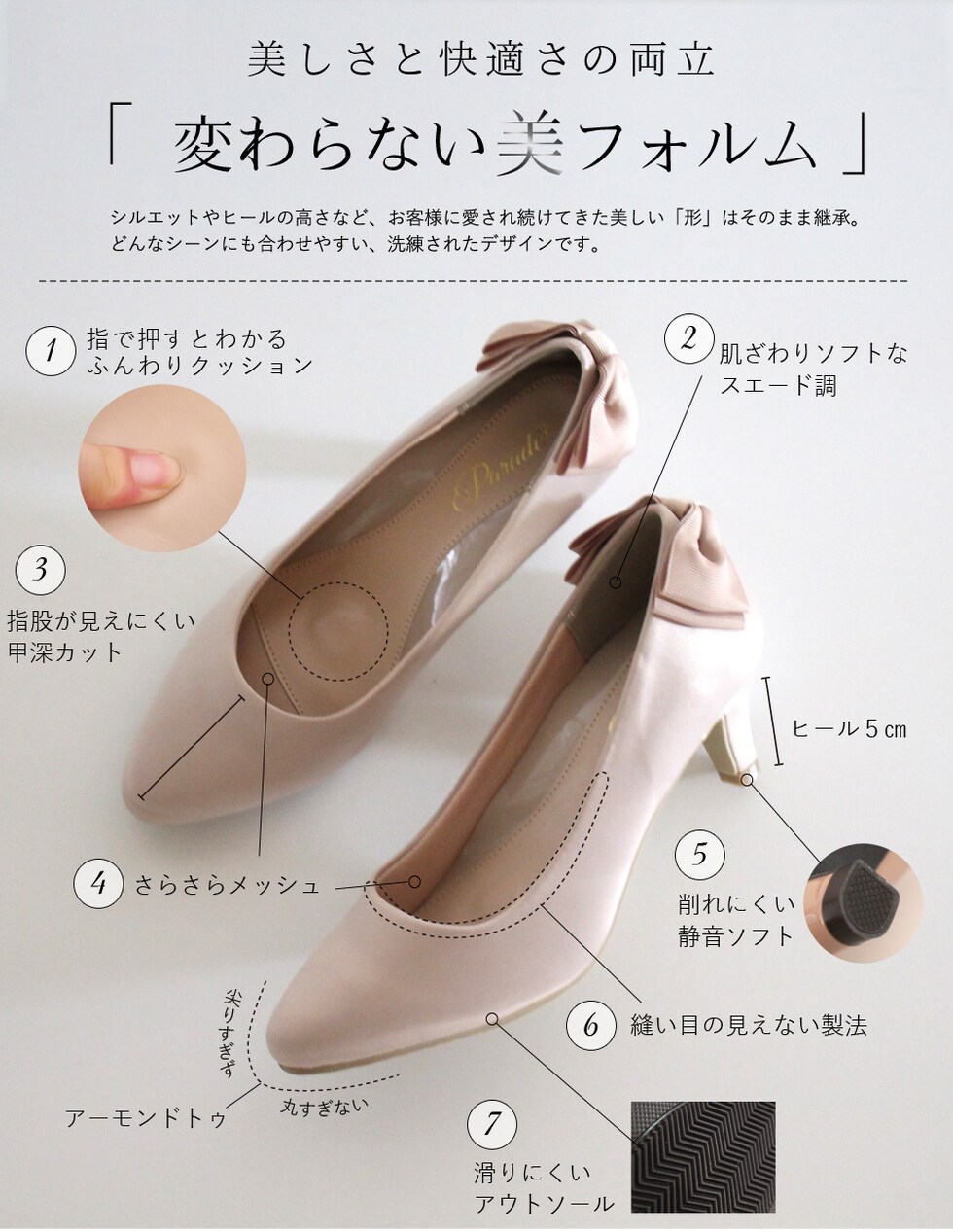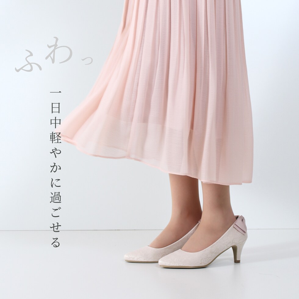 | 8年愛され続けるロングセラーシリーズが、さらにクッション感アップしてリニューアル! リピーター様へ朗報!愛されたデザインはそのままに、履き心地が進化。 長時間の着用で最も悩む「つま先の痛み」と「窮屈さ」を根本から解決。つま先のクッションをさらに肉厚にボリュームアップ!クッション材を追加した分、つま先周りの設計はゆったりと余裕のある履き心地に進化しました。愛されフェミニン系女子は、後ろ姿も可愛く見惚れる存在。特別な日のドレスアップにピッタリ。踵のバックリボンが上品で女性らしいデザインです。愛された美しい形はそのままに、履き心地だけを極めた新・極ふわっを体験してください。 |