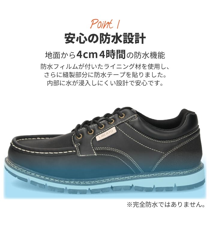 ・突然の雨でも安心!接地面から約4cm・4時間の防水設計(※完全防水ではありません)・靴内部に防水フィルム+縫製部分に防水テープ使用で水が入りにくい構造・屋内外で活躍するラバーグリップソール採用(タテ・ヨコ方向に優れた防滑性)・クッション性の高いインソールは取り外し可能・肉厚アッパーで足馴染みが良く、履き心地良好・通勤・通学・デートなど幅広いシーンにマッチするデザイン