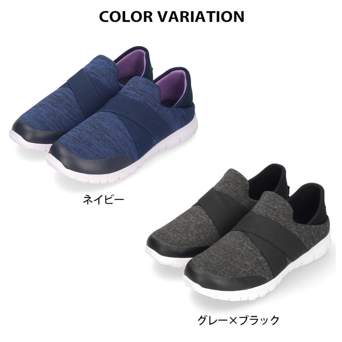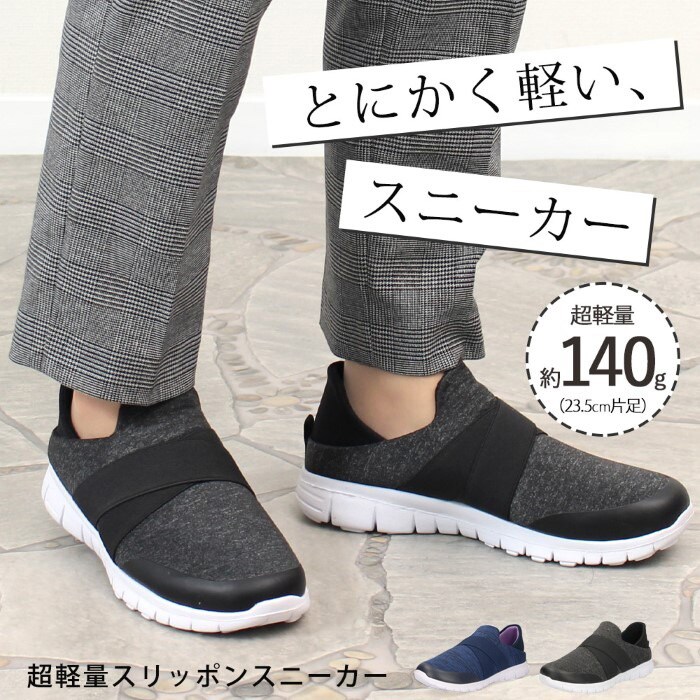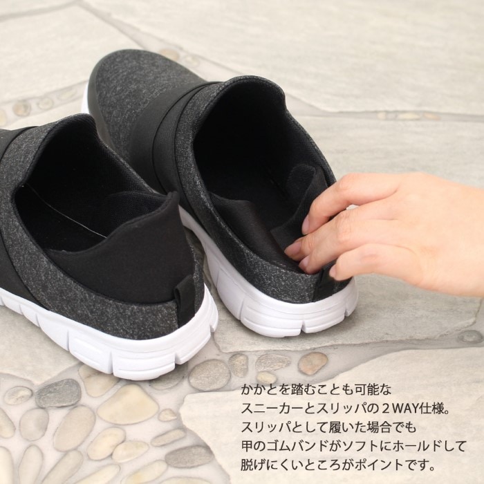 | 爽やか!軽い!さっと履ける!踵が踏める快適スニーカー 履いていることを忘れてしまいそうな片足約140gという驚異のかるさ。もちろん軽いだけではなく、履き心地にもこだわりました。 足の形に沈み込む低反発のクッションが歩行時の足裏への衝撃を軽減。リラックスできる履き心地で毎日の使用におススメです。 スリッポンタイプで脱ぎ履きが楽なのも嬉しいポイントです。 かかとを踏むことも可能。スニーカーとスリッパの2WAY仕様。 スリッパとして履いた場合でも甲のゴムバンドがソフトにホールドして脱げにくいところがポイントです。 |