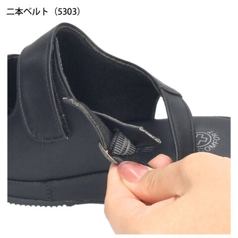 ●足に合わせてベルトで調節可能。バックルの内側に隠しゴムが付いており、脱ぎ履きしやすい設計
