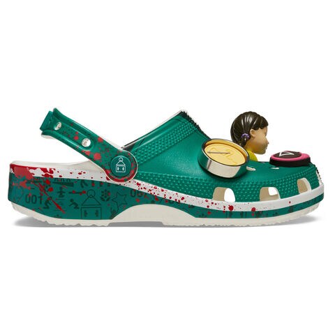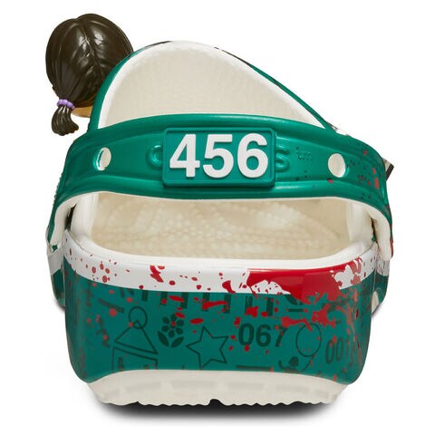 イカゲーム クラシック クロッグでゲームに備える 全体にグリーンのトラックスーツのプリントと飛び散った血をデザインした衝撃スタイル。