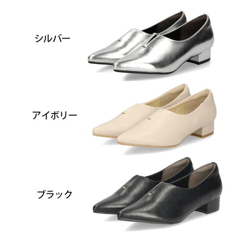 また、深めのカット が足をしっかり包み込み、上品なシルエットを演出。オフィスシーンやフォーマルな場面、普段使いにもぴったりな一足です。カラーは ブラック・アイボリー・シルバー の3色展開。どんなコーディネートにも合わせやすい万能デザインです。