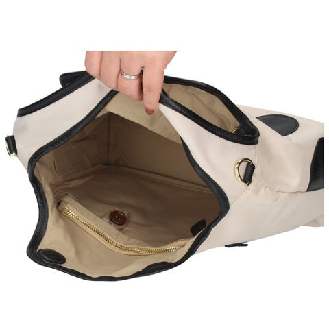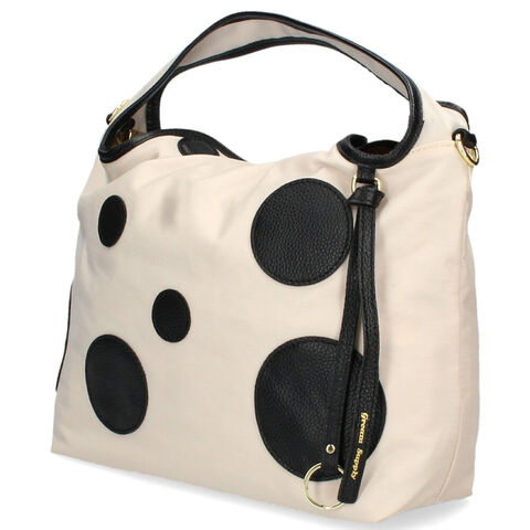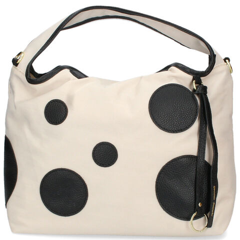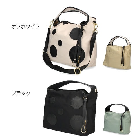 本体のポリナイロンに丸型にカットした牛革を載せた手提げバッグです。