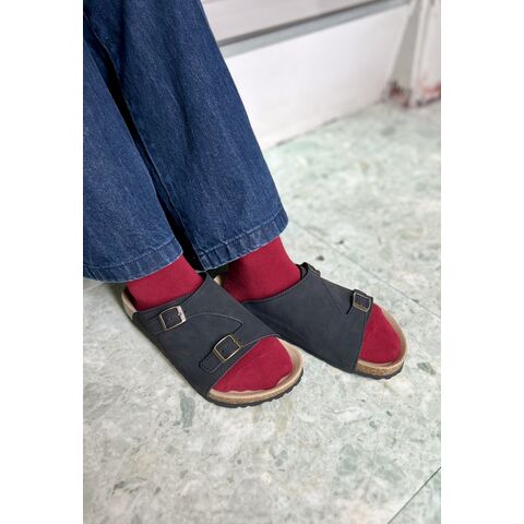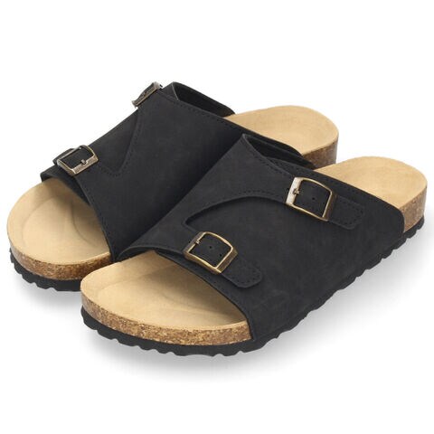 ナチュラルな雰囲気の合成スエード素材に、調整可能な2本の金属バックルを配し、自分にぴったりのフィット感に調節可能。