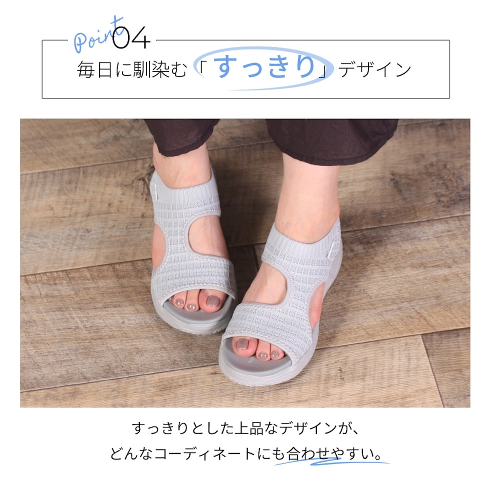 | 履くだけで夏を快適に。 柔らかワッフルニット×厚底で、軽やかおしゃれサンダル。 北欧ブランド「moz(モズ)」のニットサンダルは、ワッフルみたいな編み込み柄が特徴のニット素材。 足にやさしくフィットする素材なので足に悩みを抱えている方にもオススメしたい一足。 【POINT】 ・クッション入りの厚底ソールなのに驚くほど軽量で長時間の歩行でも快適に。 ・ワッフルニット素材が足に柔らかくフィット。肌触りのよさと伸縮性で痛くなりにくい。 ・通気性が良く素足でも快適に履けるので、春夏のデイリー使いにもぴったり。 ・高見えデザインでどんなコーディネートにも合わせやすい! ・ボリュームのある厚底で美脚&足長効果でスタイルアップを実現し上品な足元に。 すっきりデザインと柔らかい素材で脱ぎ履きが簡単に。 普段使いはもちろん、旅行やレジャーや野外イベントなどのアウトドア、ショッピングなど色々な場面に幅広く対応! カラーは、アイボリー・グレー・ブラックの3色展開。どんなファッションにも合わせやすく、色違いで揃える方も多数。 この春夏、おしゃれも快適さも妥協したくない方はぜひお試しください。 |