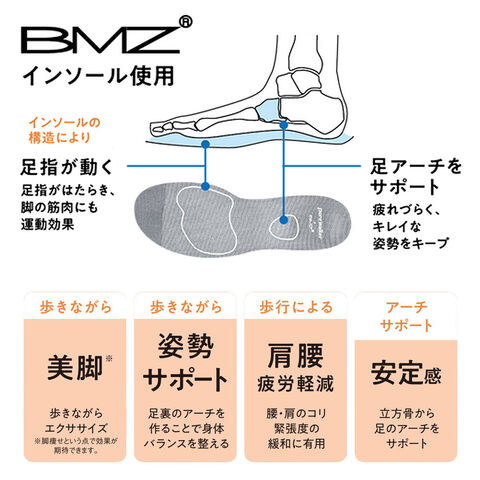 BMZインソールが足指をしっかり使わせ、脚の筋肉にも運動効果を発揮。さらに足裏アーチをサポートして姿勢を整え、腰や肩への負担を軽減します。