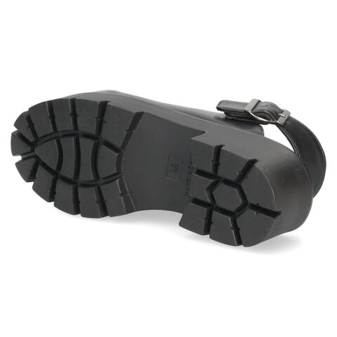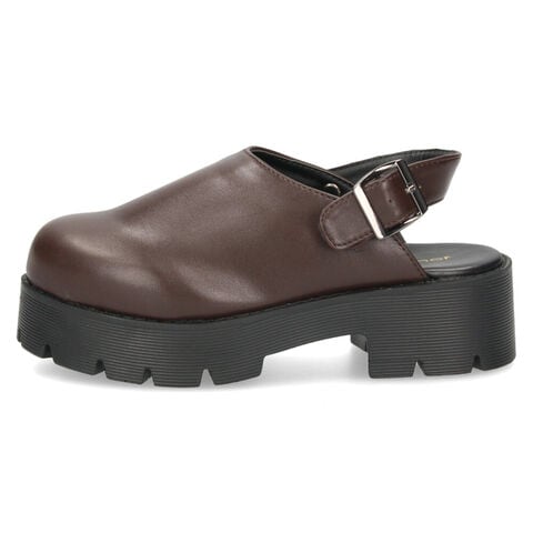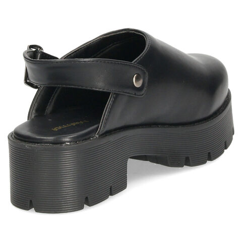 つま先をすっぽり覆う甲深デザインに、調整できるバックベルトを合わせた厚底靴。