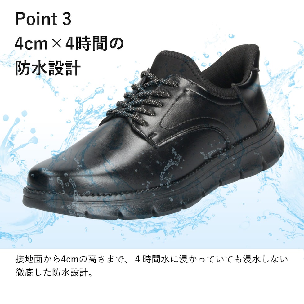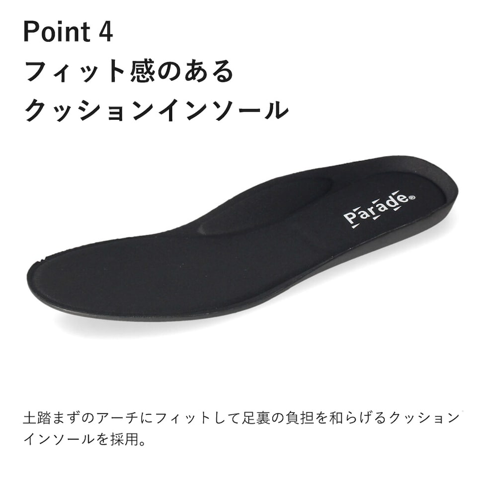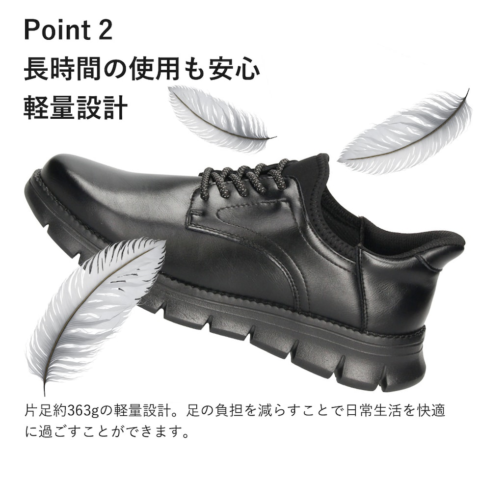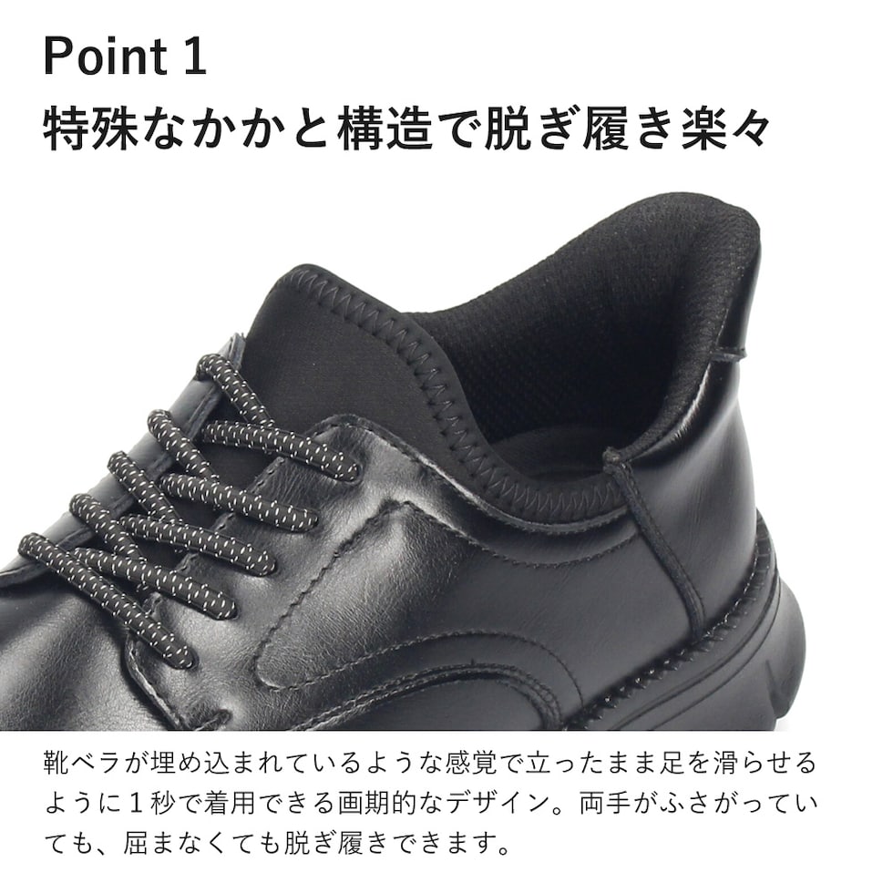 | ハンズフリーで楽に履ける!防水&快適なカジュアルシューズ Paradeの「楽すぽっ」シリーズより、スニーカーのような軽やかな履き心地と、レザーシューズのような上品さを兼ね備えたメンズカジュアルシューズが登場。 特殊なかかと構造により、手を使わずサッと履けるハンズフリー設計で、忙しい朝もストレスフリー。 土踏まずのアーチにやさしくフィットするインソールが足裏をしっかりサポートし、軽量構造と相まって、長時間の歩行も快適。 さらに、4cm×4時間の防水仕様で急な天候の変化にも安心。 実用性と品の良さを兼ね備え、日常のさまざまなシーンで活躍する万能シューズです。 |