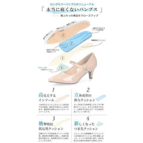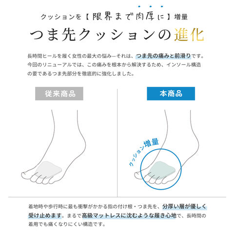 | 8年愛され続けるロングセラーシリーズが、さらにクッション感アップしてリニューアル! リピーター様へ朗報!愛されたデザインはそのままに、履き心地が進化。長時間の着用で最も悩む「つま先の痛み」と「窮屈さ」を根本から解決。つま先のクッションをさらに肉厚にボリュームアップ!クッション材を追加した分、つま先周りの設計はゆったりと余裕のある履き心地に進化しました。ワンストラップで脱げにくく、着脱も簡単。シンプルなデザインだからこそ様々なスタイルに合わせやすい。愛された美しい形はそのままに、履き心地だけを極めた新・極ふわっを体験してください。普段使いはもちろんのこと、ビジネス、パーティ、オケージョンシーンでもマルチにお使いいただけます。極ふわっクッションが気持ちいい♪とリピーターも多いロングセラーシリーズをぜひお試しください! |