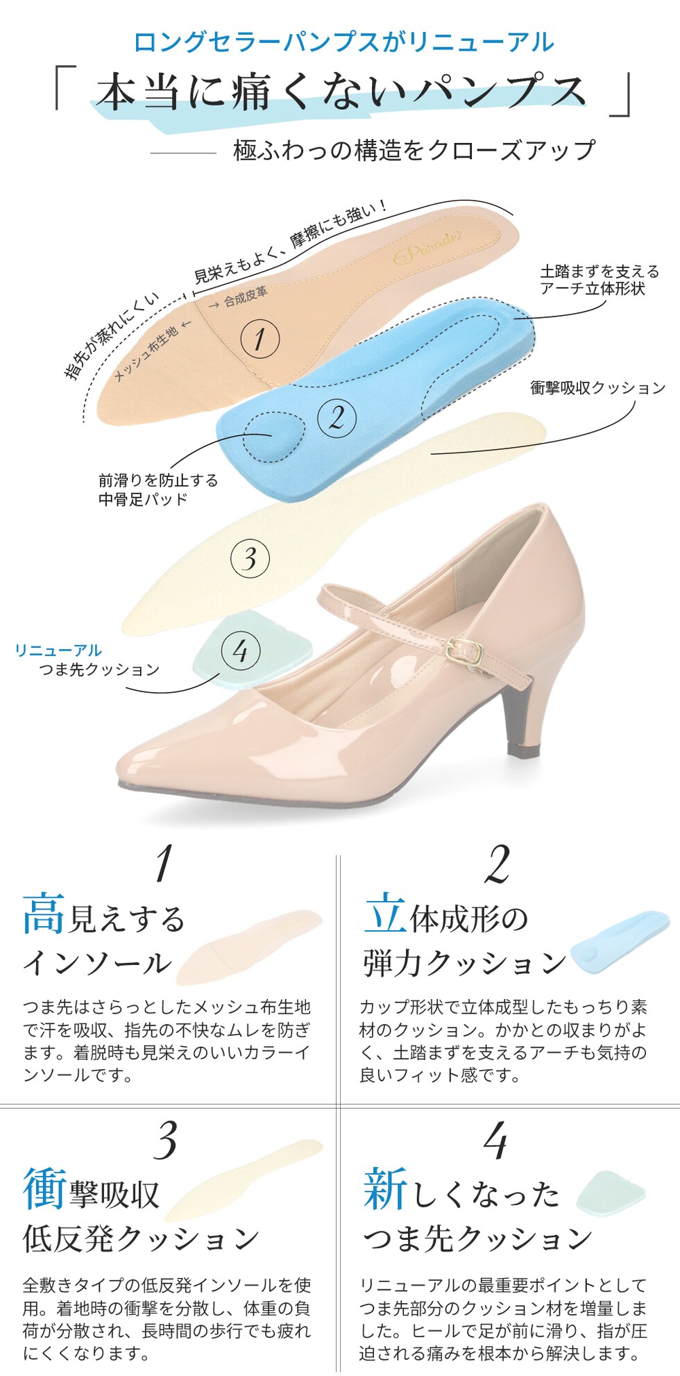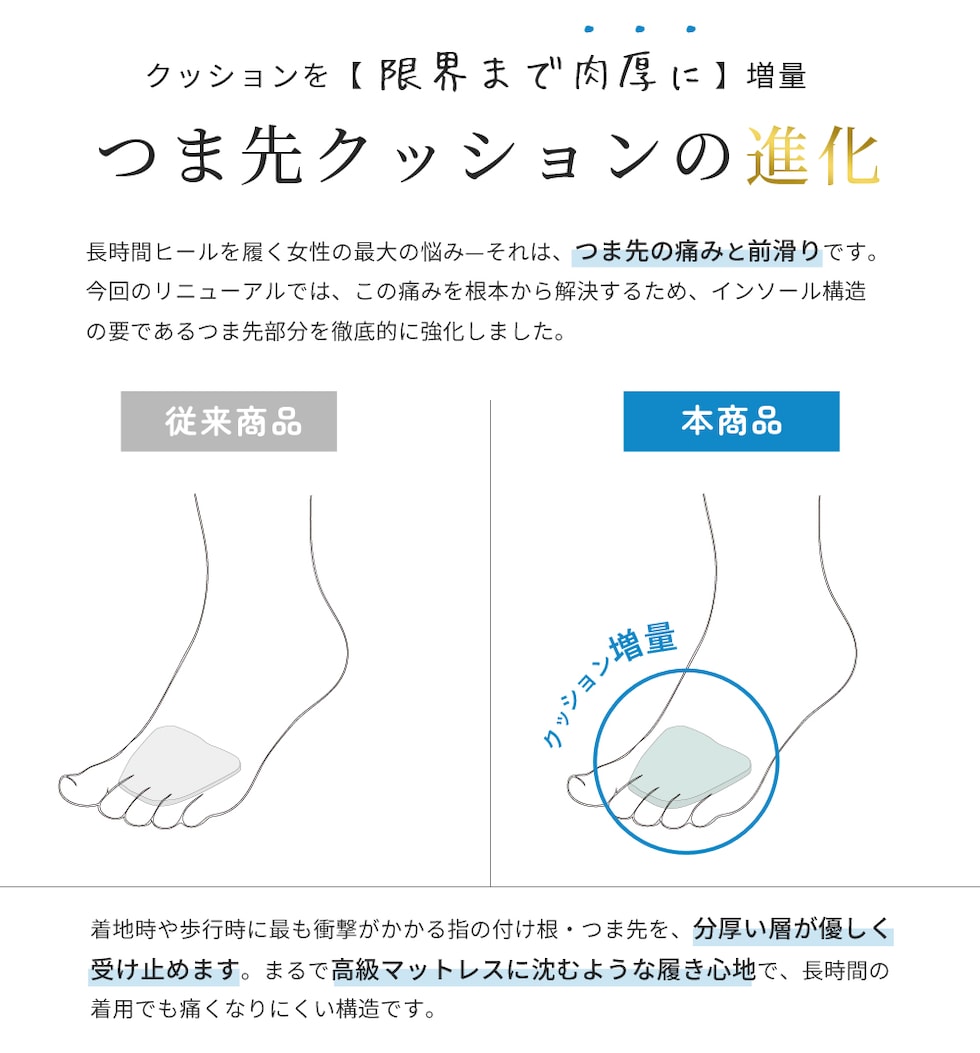 | 8年愛され続けるロングセラーシリーズが、さらにクッション感アップしてリニューアル! リピーター様へ朗報!愛されたデザインはそのままに、履き心地が進化。長時間の着用で最も悩む「つま先の痛み」と「窮屈さ」を根本から解決。つま先のクッションをさらに肉厚にボリュームアップ!クッション材を追加した分、つま先周りの設計はゆったりと余裕のある履き心地に進化しました。ワンストラップで脱げにくく、着脱も簡単。シンプルなデザインだからこそ様々なスタイルに合わせやすい。愛された美しい形はそのままに、履き心地だけを極めた新・極ふわっを体験してください。普段使いはもちろんのこと、ビジネス、パーティ、オケージョンシーンでもマルチにお使いいただけます。極ふわっクッションが気持ちいい♪とリピーターも多いロングセラーシリーズをぜひお試しください! |