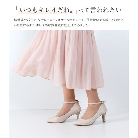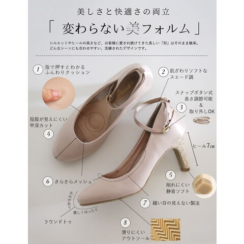 | 8年愛され続けるロングセラーシリーズが、さらにクッション感アップしてリニューアル! リピーター様へ朗報!愛されたデザインはそのままに、履き心地が進化。長時間の着用で最も悩む「つま先の痛み」と「窮屈さ」を根本から解決。つま先のクッションをさらに肉厚にボリュームアップ!クッション材を追加した分、つま先周りの設計はゆったりと余裕のある履き心地に進化しました。愛された美しい形はそのままに、履き心地だけを極めた新・極ふわっを体験してください。ドレスアップにはもちろんのこと、普段のコーディネイトでもお使いいただけます。ストラップは取り外し可能な2way仕様です。 |