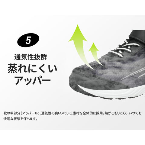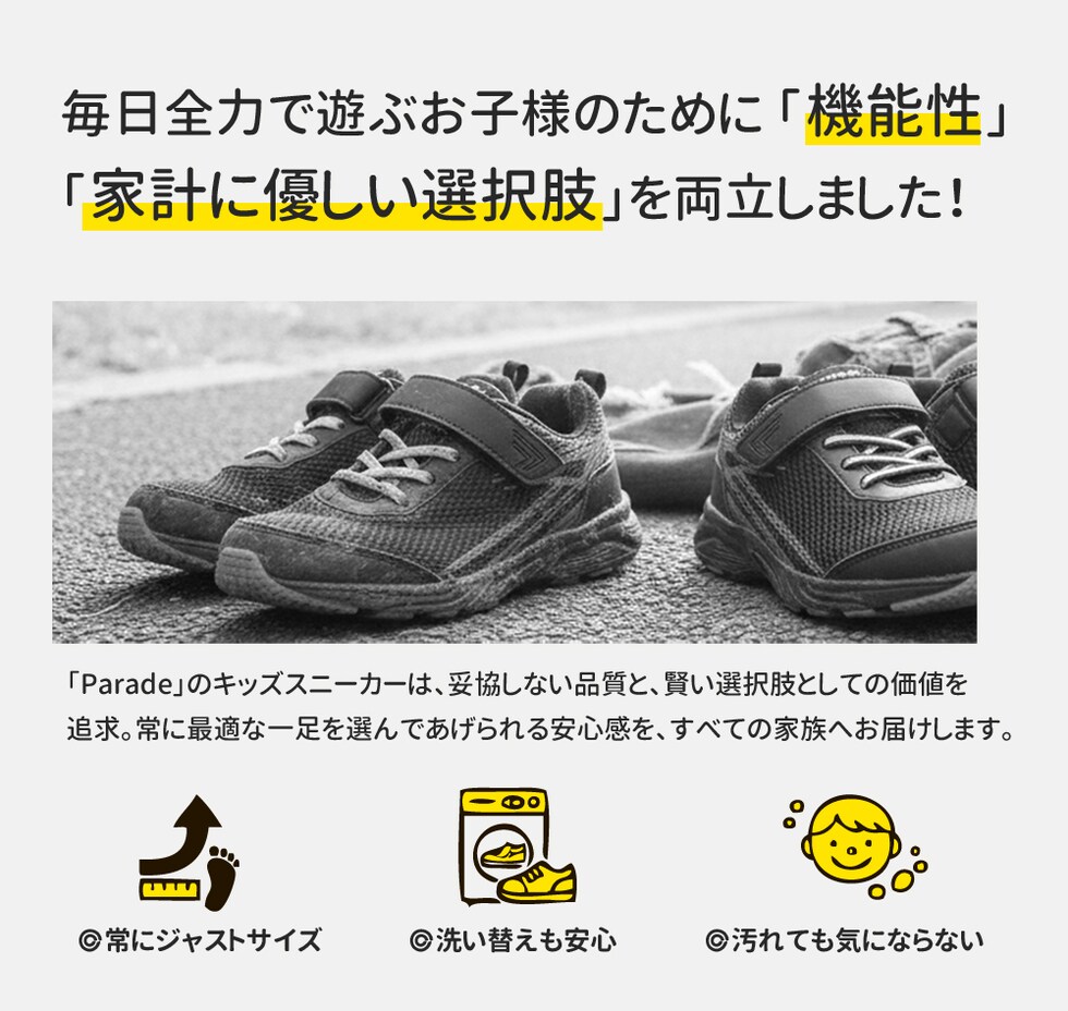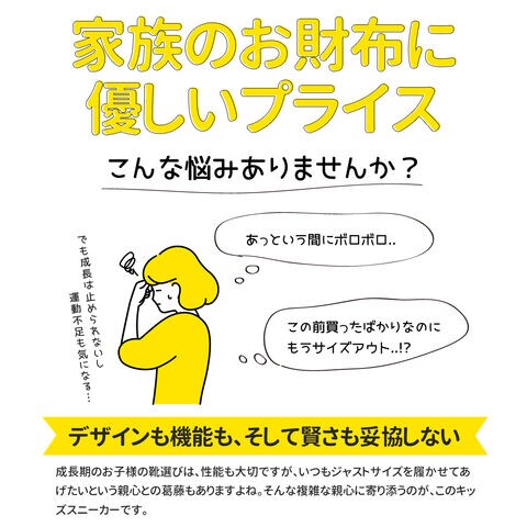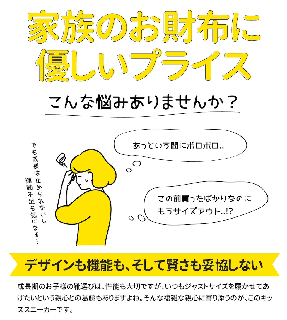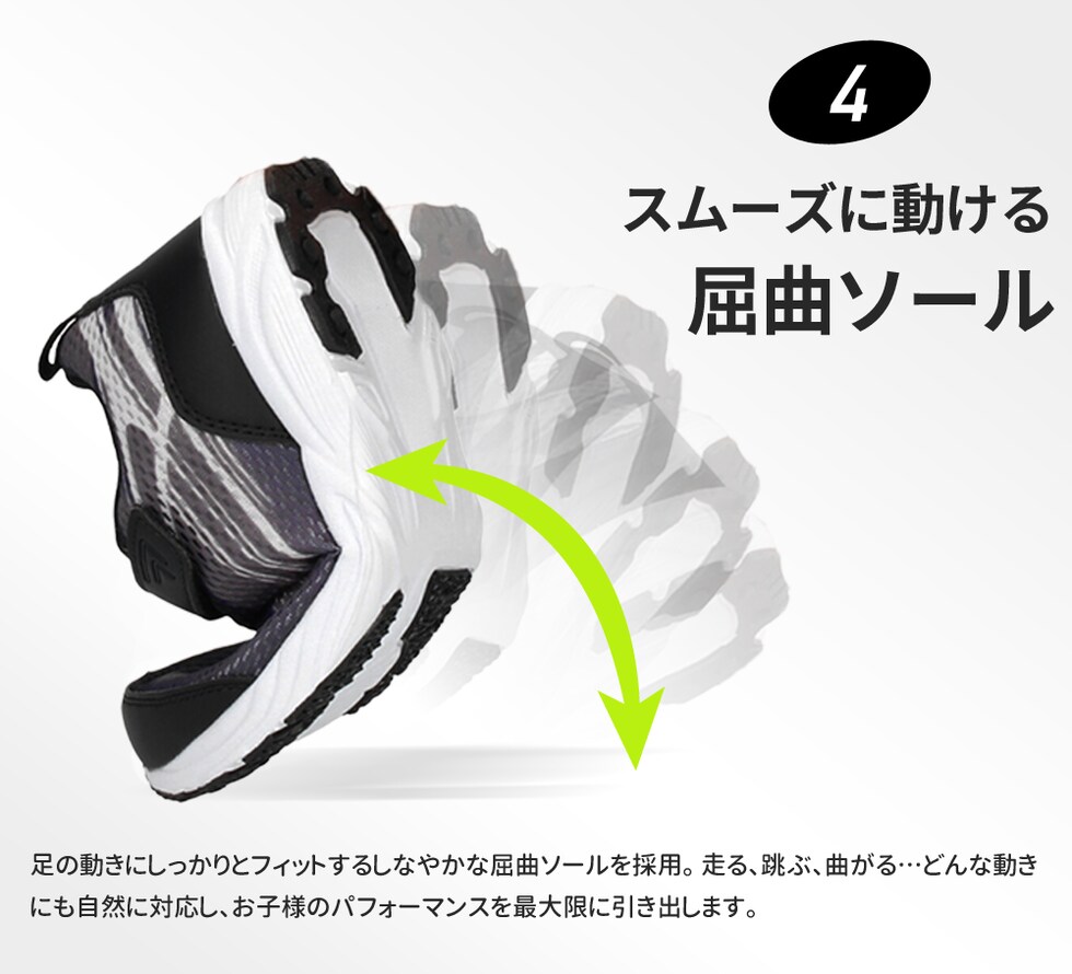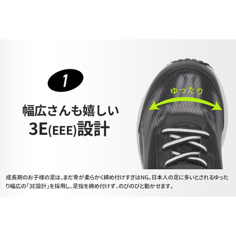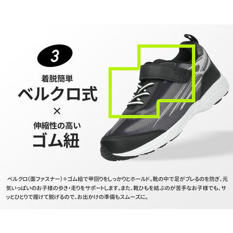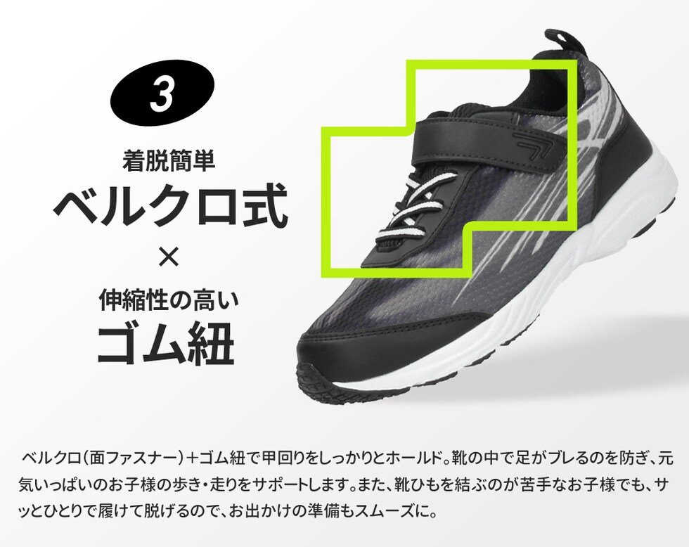 | 速く走れて、動きやすい! カラフルな色から選べる「キミだけの最強シューズ」 元気いっぱいなキッズのための高機能スニーカーが登場! 学校や公園、スポーツにも大活躍のポイントが詰まっています。 5つの「楽」ポイントで成長期の足をサポート! 1.楽々フィットの〔幅広3E設計〕 日本人に多いとされる幅広な足のお子様でも、締め付けすぎずゆったり履ける3Eの幅広設計。快適な履き心地で、一日中動き回っても足が痛くなりにくい! 2.羽のように軽い〔軽量設計約123g〕 まるで何も履いていないかのような軽さ! 走ったり、ジャンプしたり、お子様の動きを邪魔しません。疲れにくいから、帰宅まで元気いっぱいです。 3.着脱簡単〔ベルクロ式×ゴム紐〕 マジックテープ式ベルト:脱ぎ履きが簡単!忙しい朝や体育の時間も、お子様一人で素早くできます ゴム紐:ホールド感が高く、靴ひもを結ぶのが苦手なお子様でも簡単に履けます 4.スムーズに動ける〔屈曲ソール〕 足の動きに合わせて柔軟に曲がるソールを採用。地面をしっかりとらえ、速く走る・強く蹴るといった動きをサポートします。 5.通気性抜群〔メッシュアッパー〕 汗をかきやすいお子様の足もムレにくい!熱がこもりにくいのでいつでも快適な状態を保ちます。 |