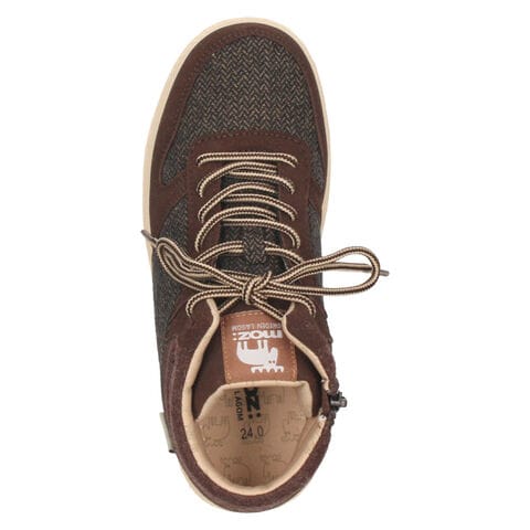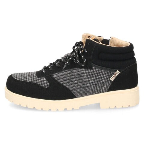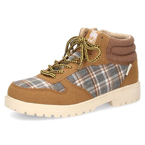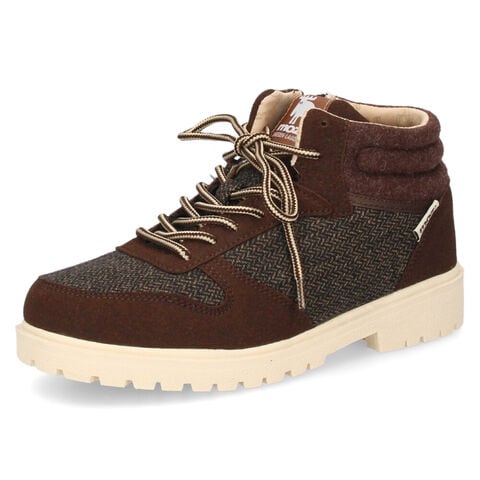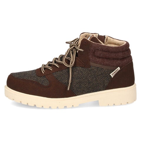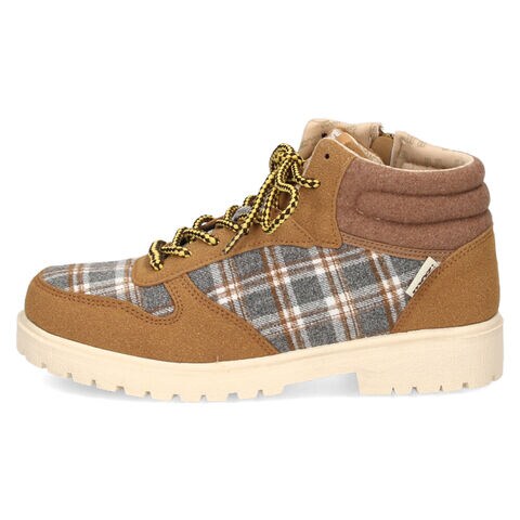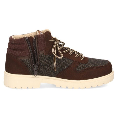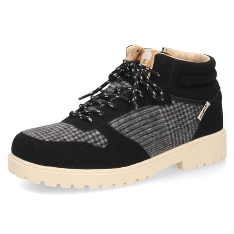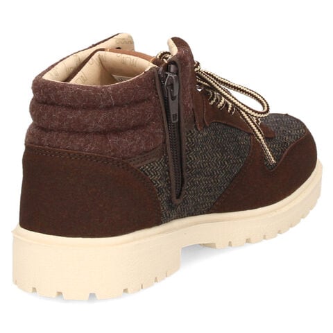 トレッキングブーツを連想させる太めの靴ひもが、足首をしっかりとホールドし、歩行時の安定感を高めます。