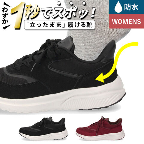 立ったままスッと履けるハンズフリー仕様のレディーススニーカーです。特殊なかかと構造により、靴ベラが埋め込まれているような感覚で足入れができ、忙しい朝や荷物が多い日にもスムーズに着用できます。