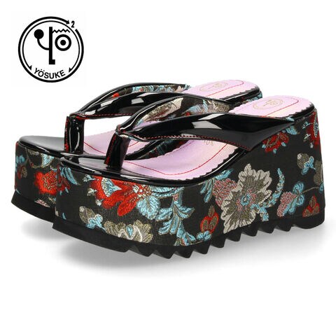 鼻緒スタイルに可愛らしい和柄、さらに厚底をつけることによりyosukeらしさを演出。
